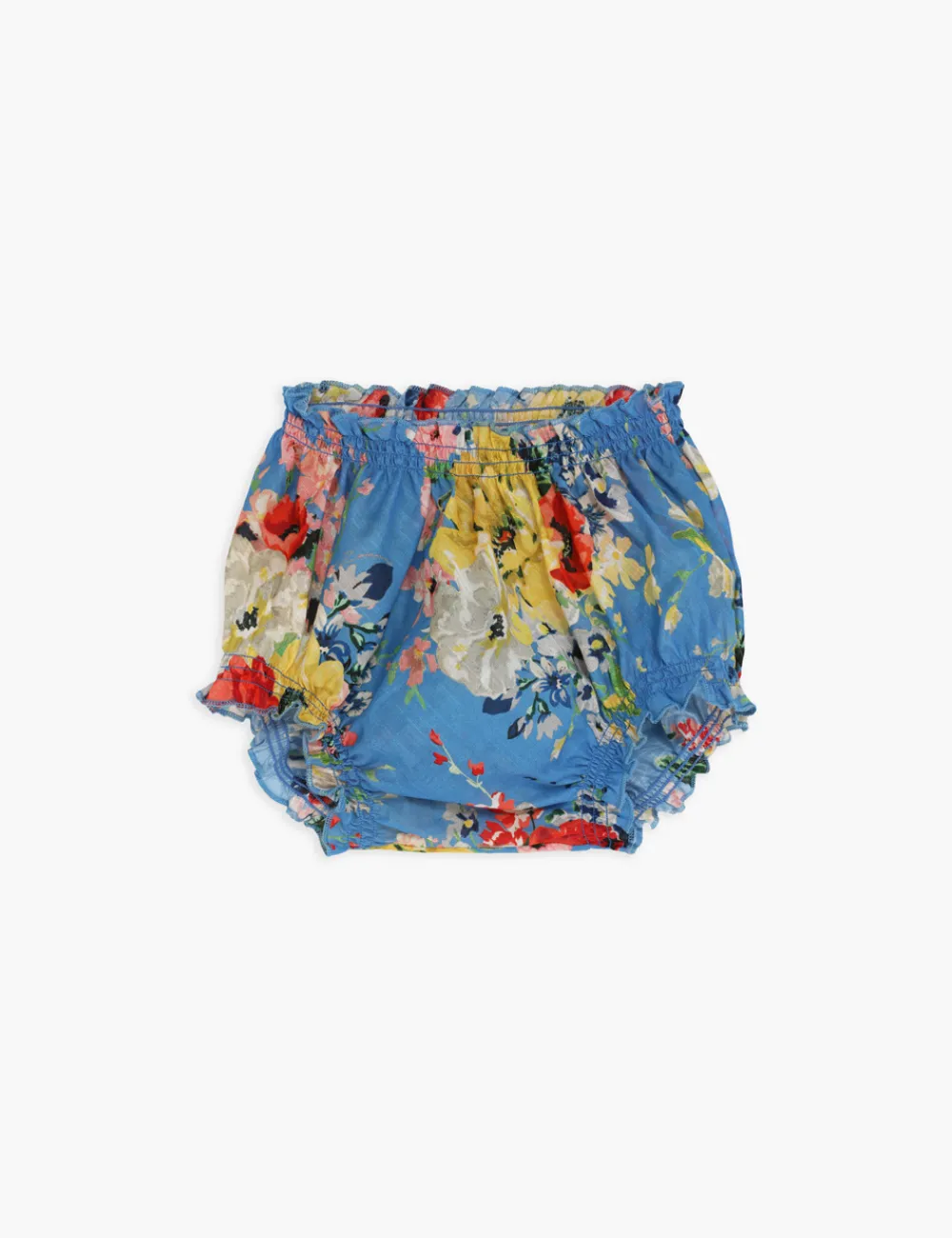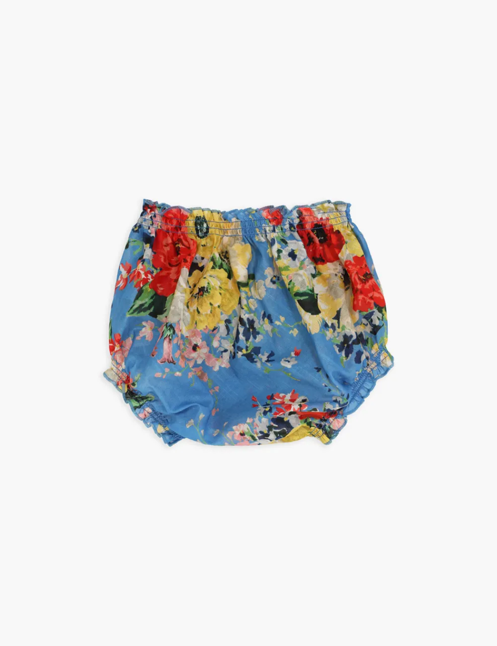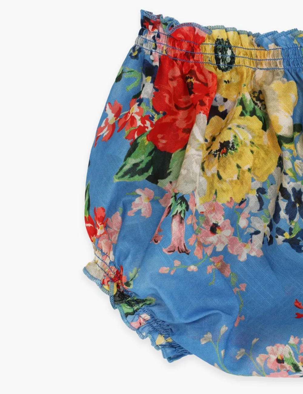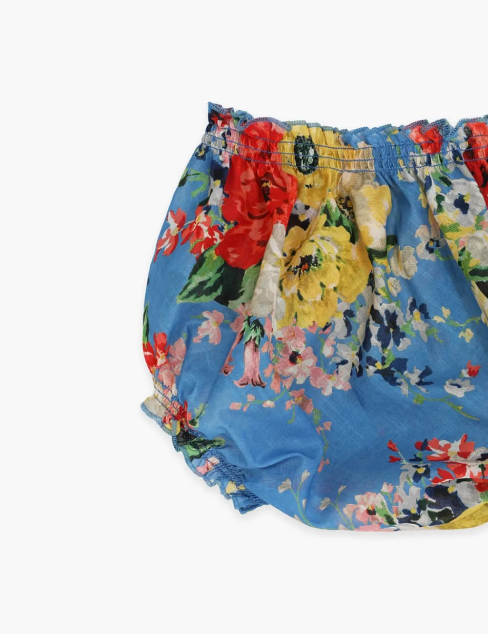 The Alight Bloomer In Blue Floral From Our Resort Swim 2024 Collection. A Cotton Bloomer With Elastic Trims And Frilled Edges.