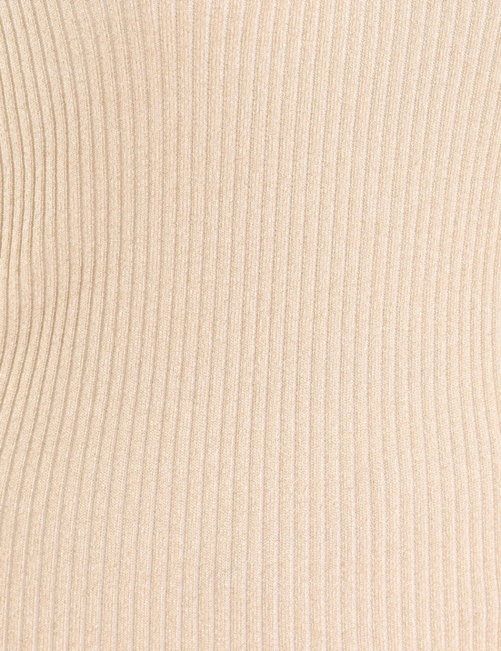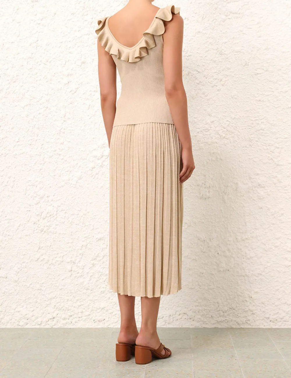 The Alight Frill V-Neck Top In Cream Lurex From Our Resort Swim 2024 Collection. A Ribbed Knit, Fitted Tank With A Frilled V-Neckline.
