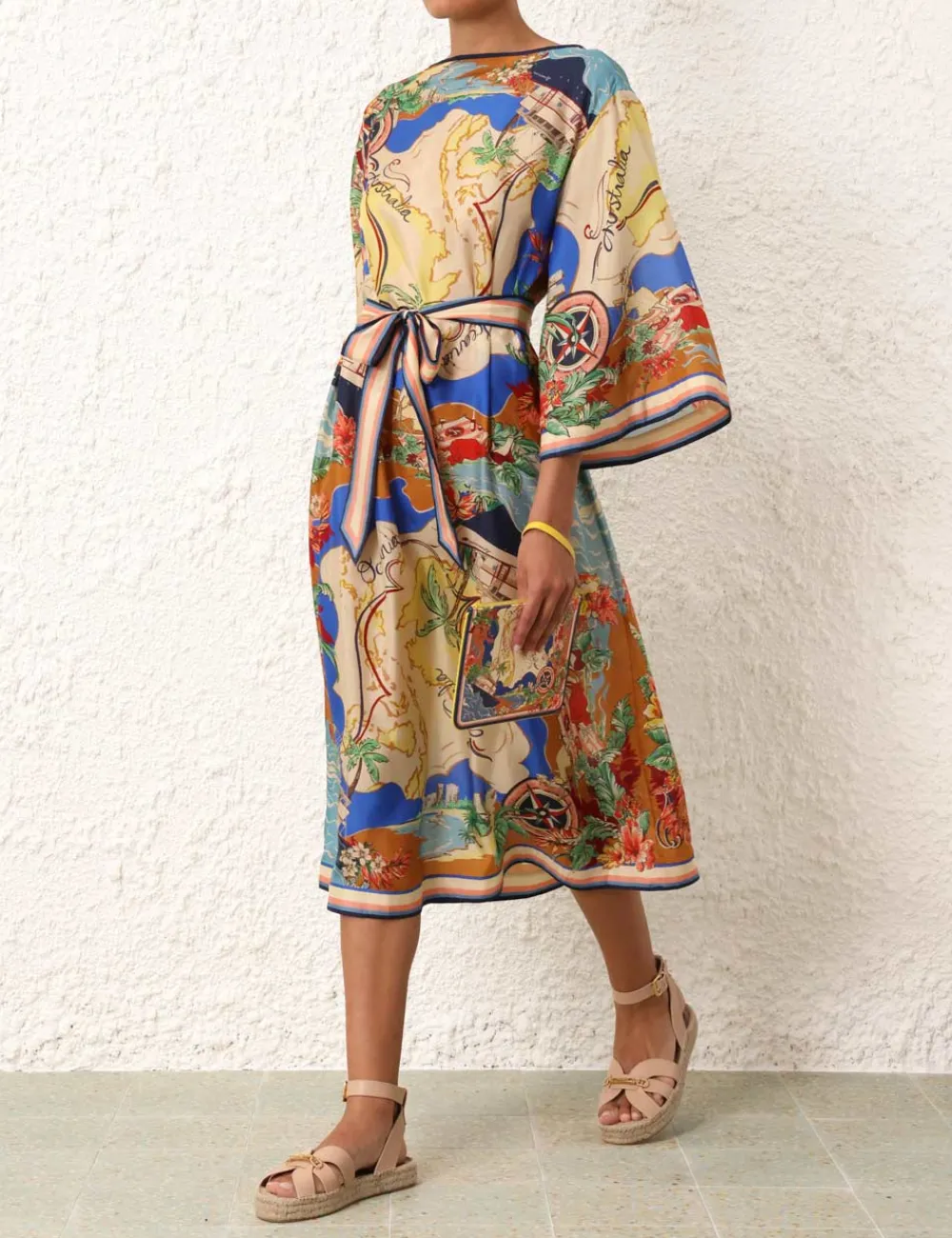 The Alight Midi Dress In Nautical Map From Our Resort Swim 2024 Collection. A Silk Wide Sleeve Midi Dress Featuring A Removable Self Belt, Placement Print And A Contrast Bind.