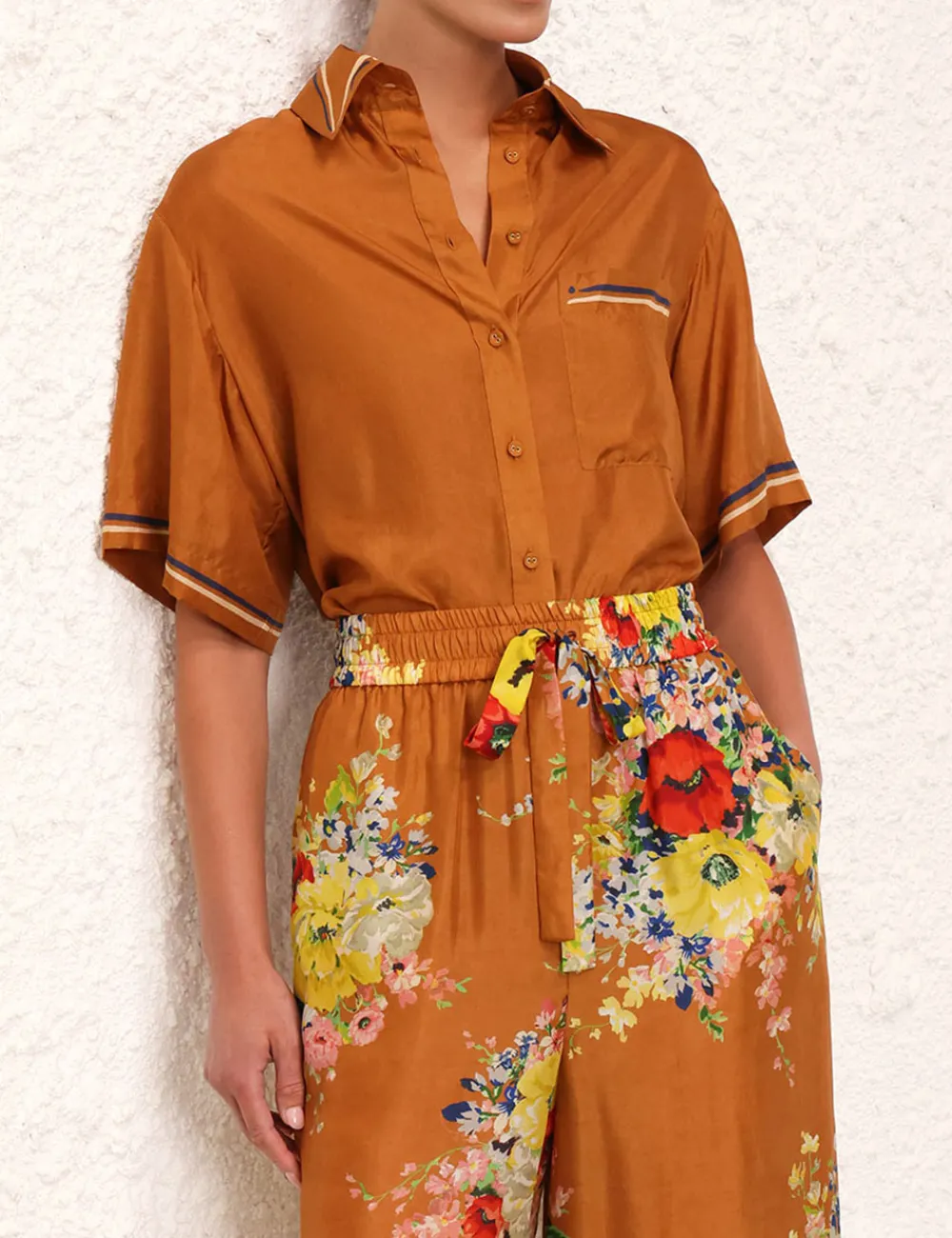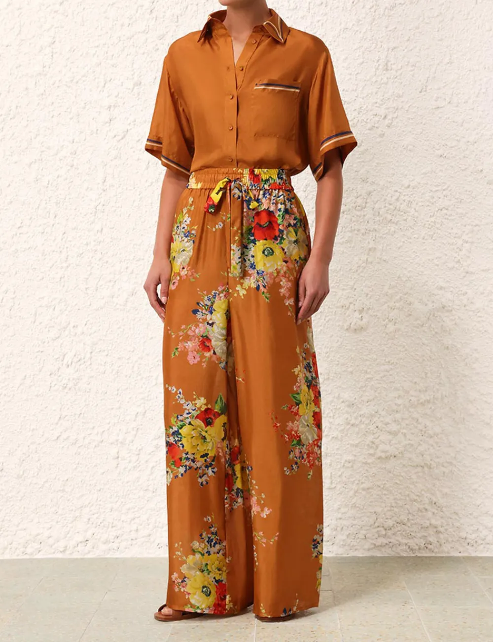 The Alight Relaxed Pant In Tan Floral From Our Resort Swim 2024 Collection. A Silk Wide Leg Pant Featuring A Drawcord Waistband.