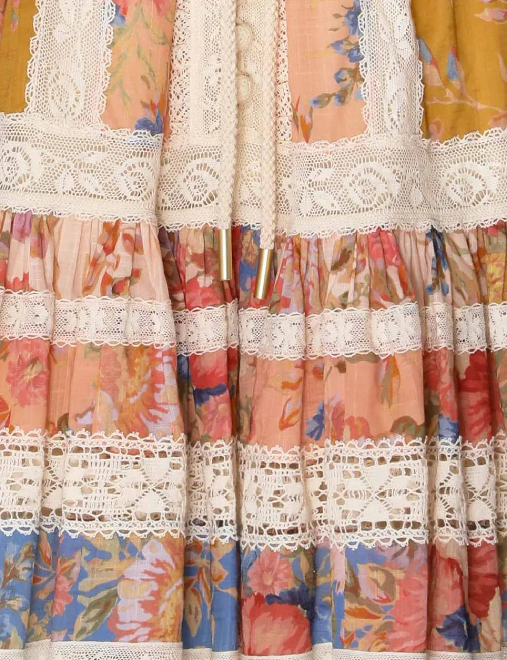 The August Lace Trimmed Mini Dress In Spliced From Our Resort Swim 2024 Collection. A Spliced Mini Dress Featuring Trim Detailing And A Button And Loop Centre Front Opening.