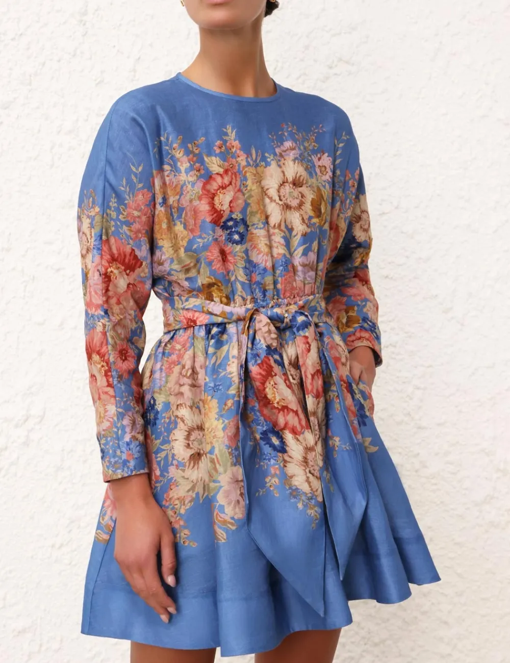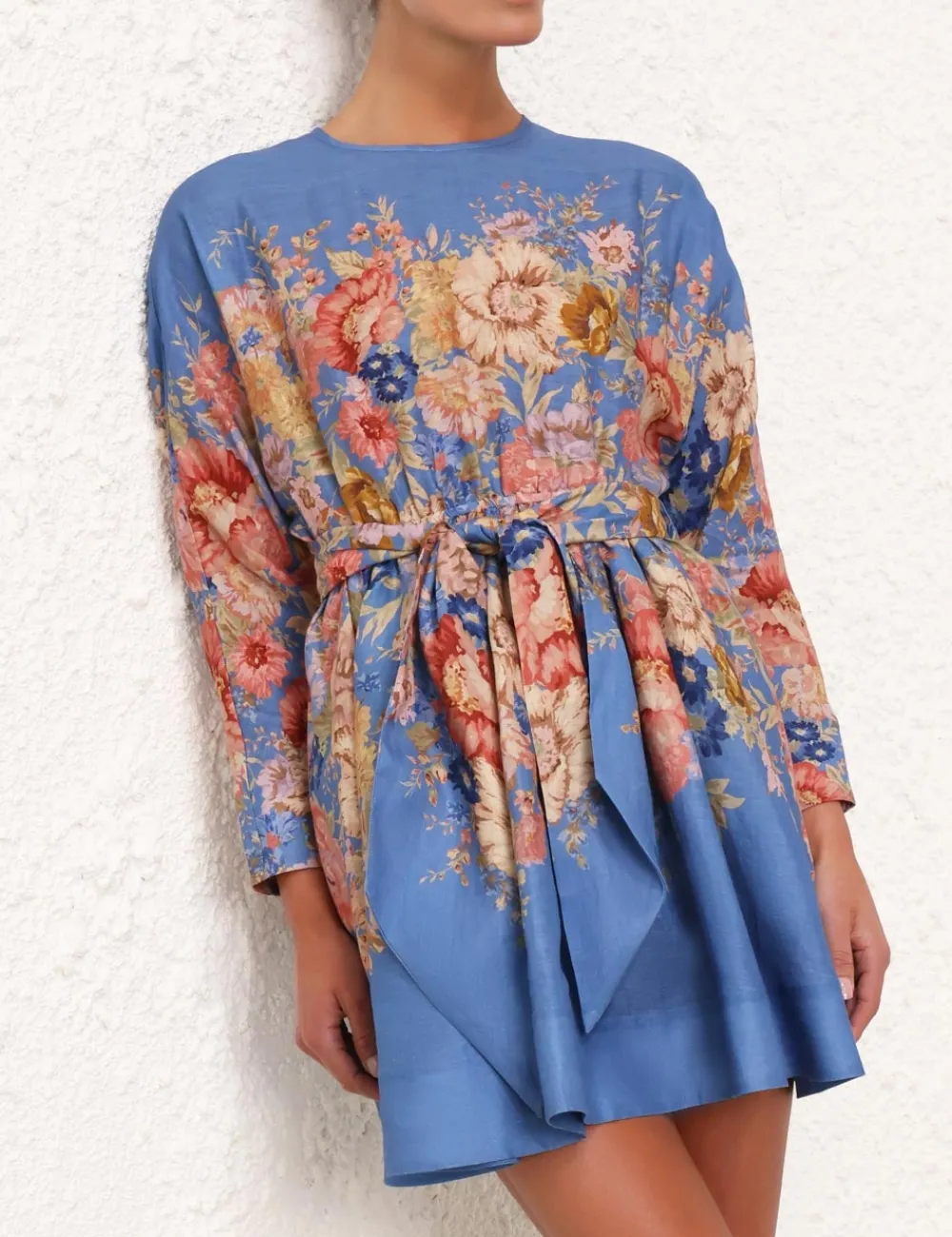 The August Long Sleeve Mini Dress In Dusty Blue Floral From Our Resort Swim 2024 Collection. A Linen Mini Dress Featuring An Elasticated Waistband And A Centre Back Keyhole.