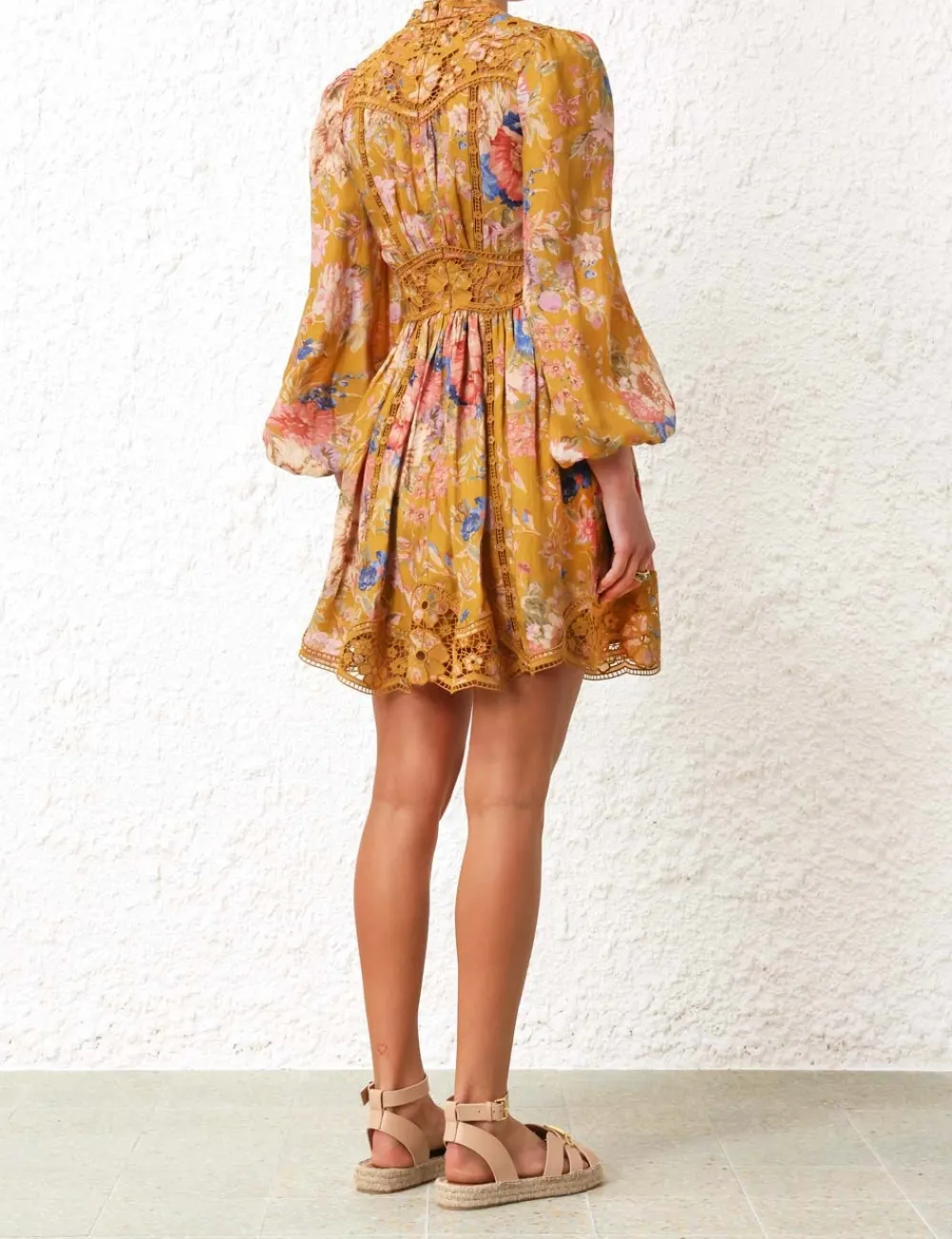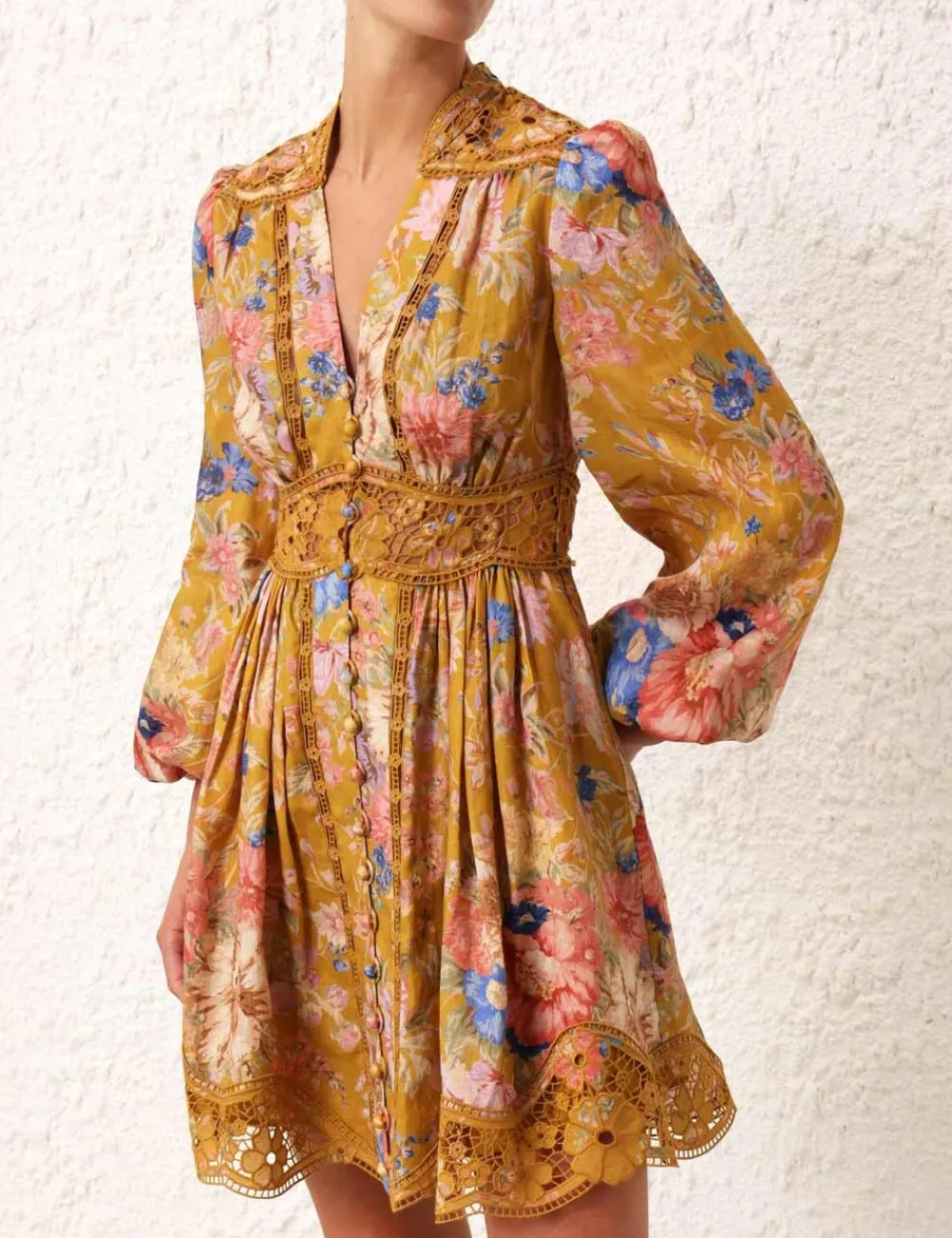 The August Plunge Mini Dress In Mustard Floral From Our Resort Swim 2024 Collection. A Linen Long Sleeve Dress Featuring A Plunging Neckline And Spaghetti Loops Along The Centre Front.