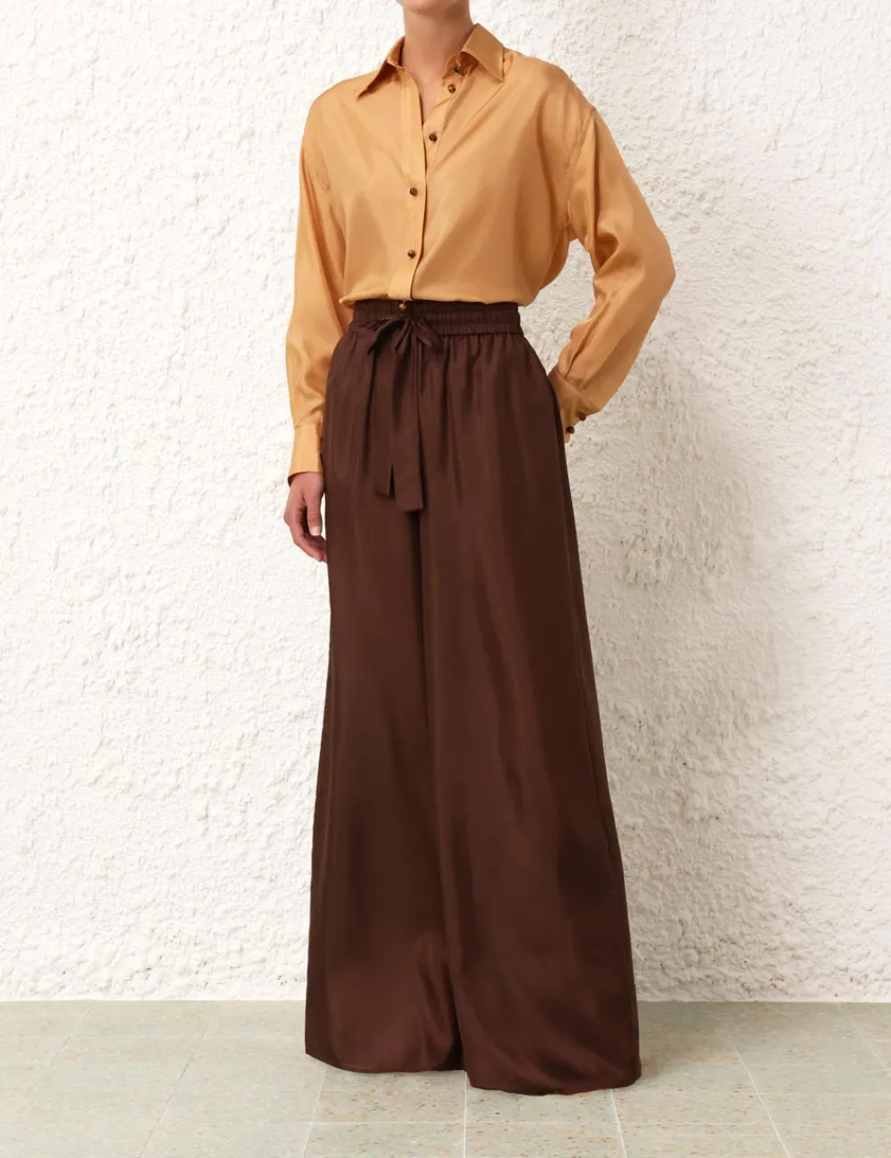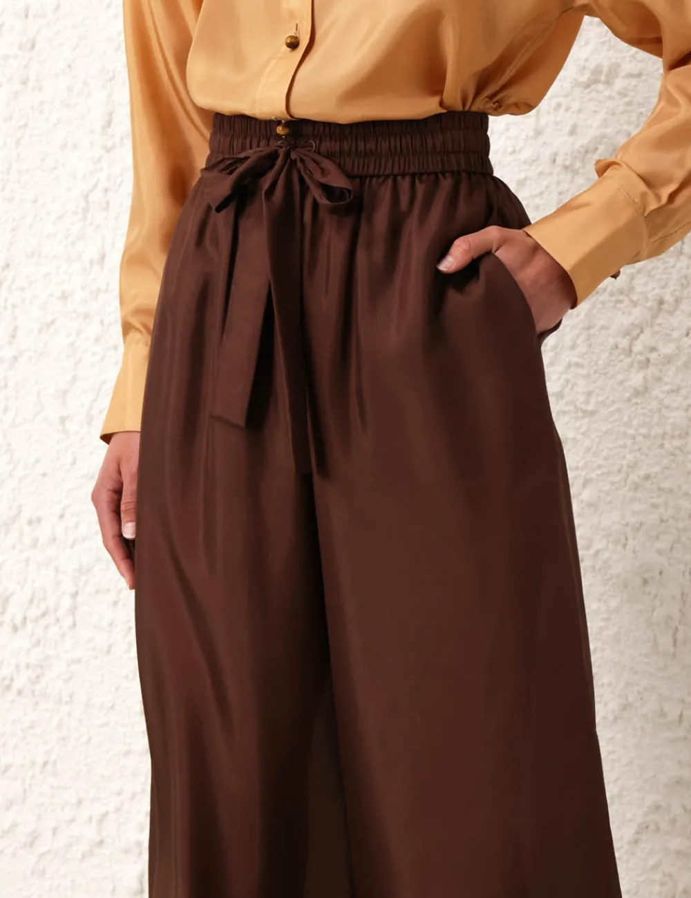 The August Relaxed Pant In Chocolate From Our Resort Swim 2024 Collection. A Silk Wide Leg Relaxed Pant Featuring An Elasticated Waistband.