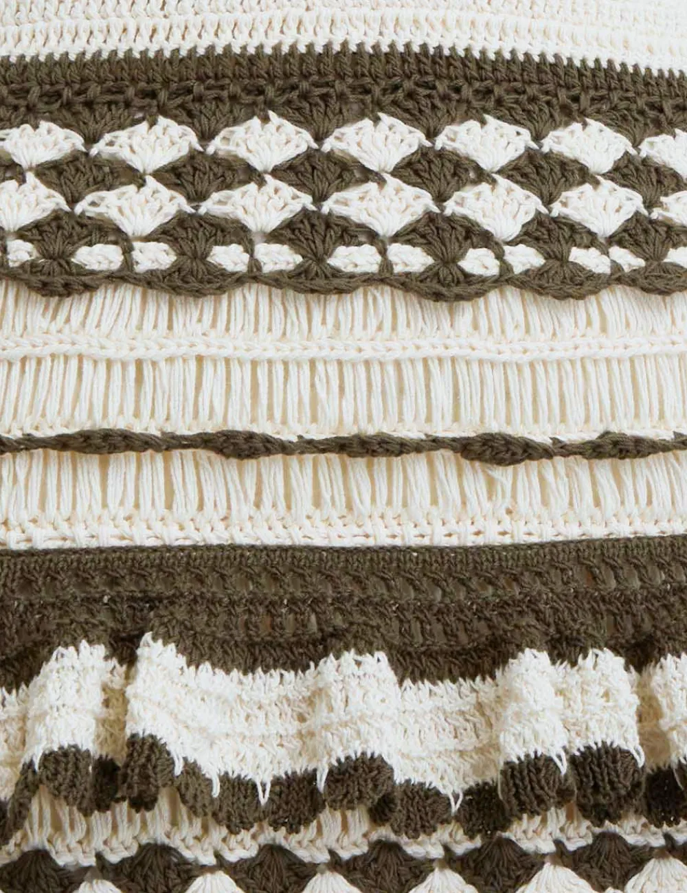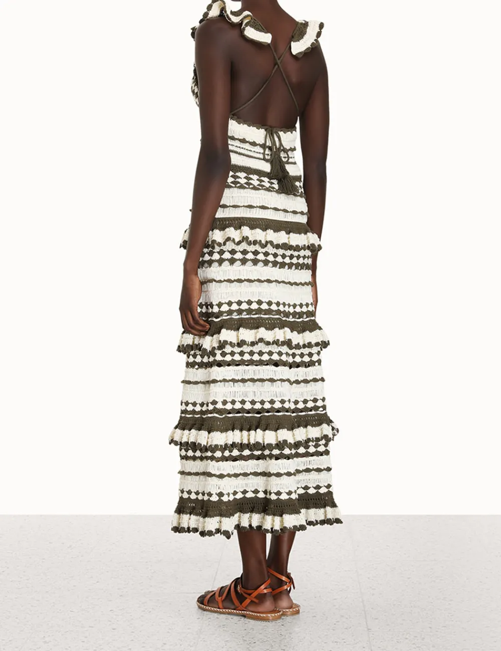 The Devi Crochet Frill Dress In Khaki Cream From Our Summer Swim 2023 Collection. A Crochet Midi Dress Featuring Frilled Shoulder Straps And A Self Tie, Cutaway Back.