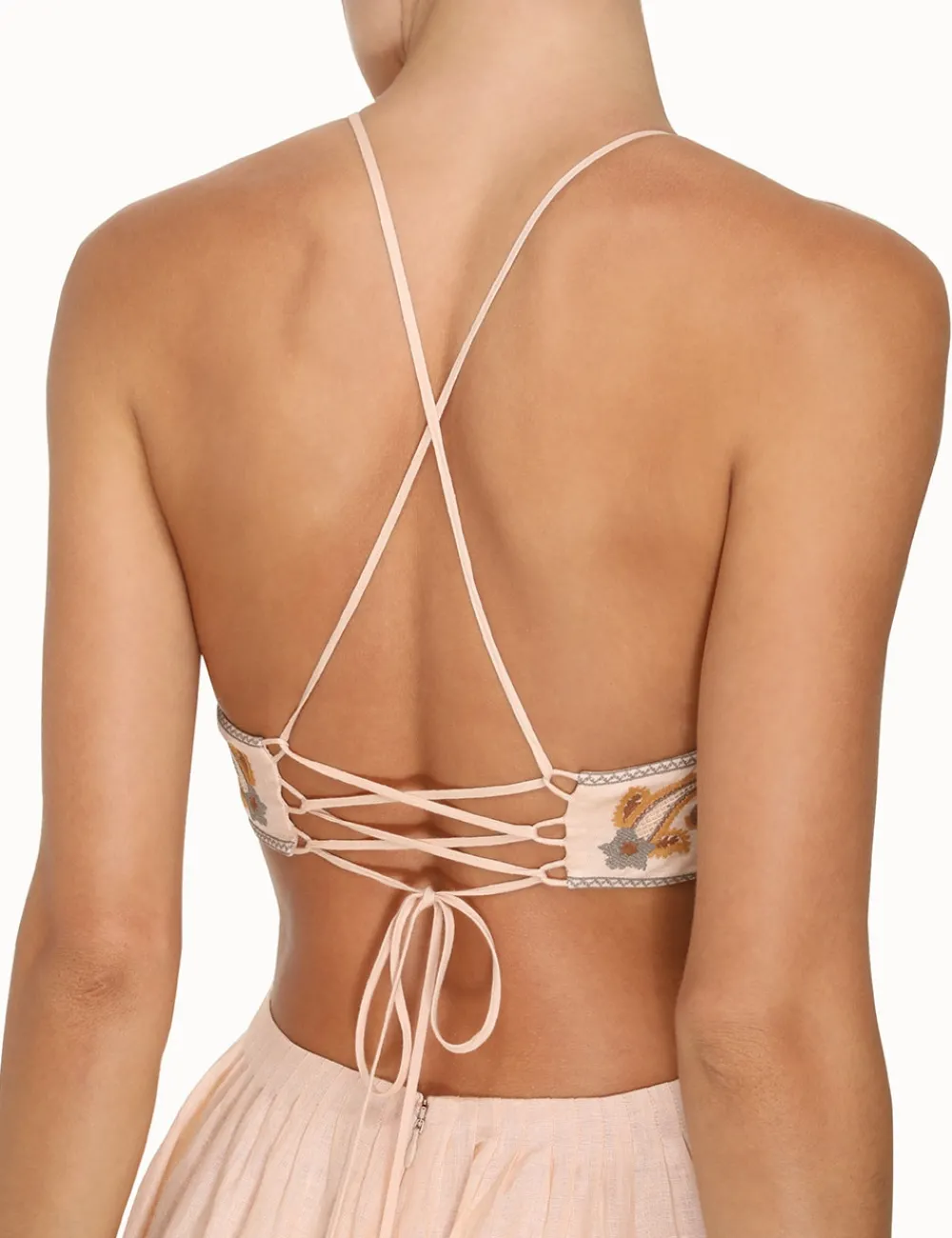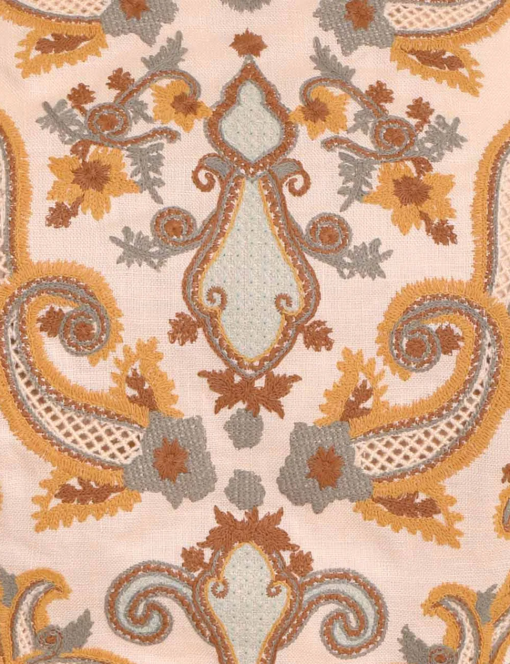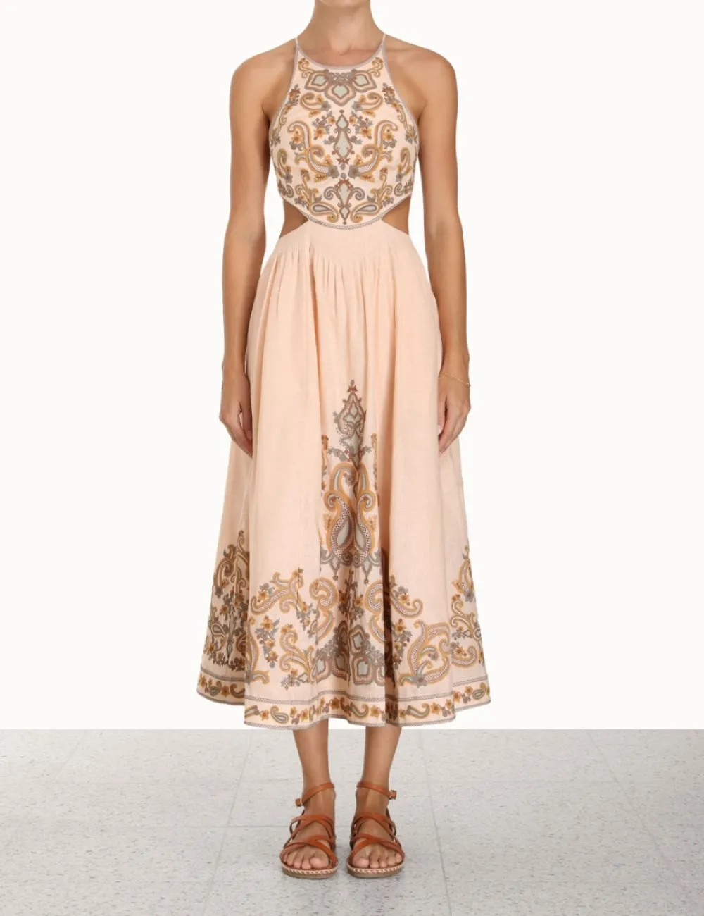 The Devi Halter Tie Midi Dress In Sage/Gold From Our Summer Swim 2023 Collection. A Linen Halter Midi Dress Featuring Placement Embroidery, Pockets, And An Invisible Zip At The Centre Back.