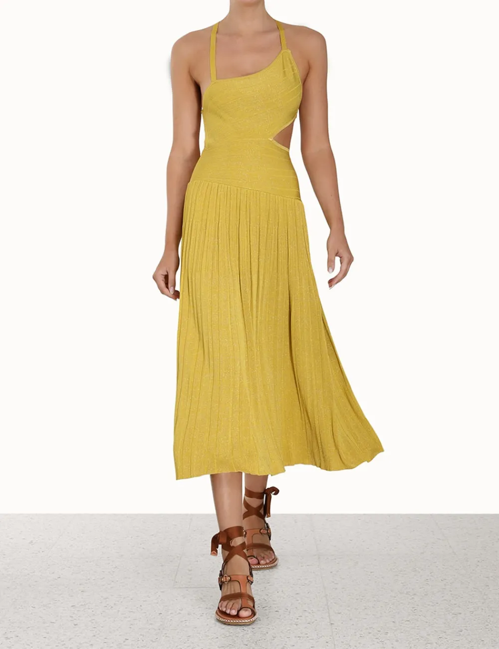 The Devi Lurex Midi Dress In Mustard From Our Summer Swim 2023 Collection. A Midi Dress Featuring An Asymmetric Neckline And Cutaway Back, Finished With Threads Of Lurex Throughout.