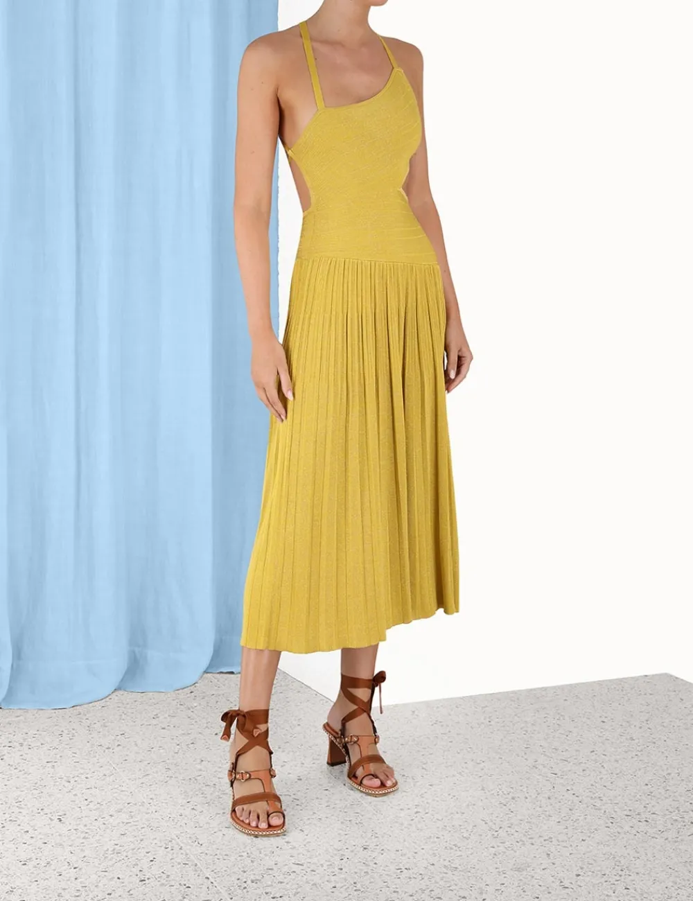 The Devi Lurex Midi Dress In Mustard From Our Summer Swim 2023 Collection. A Midi Dress Featuring An Asymmetric Neckline And Cutaway Back, Finished With Threads Of Lurex Throughout.