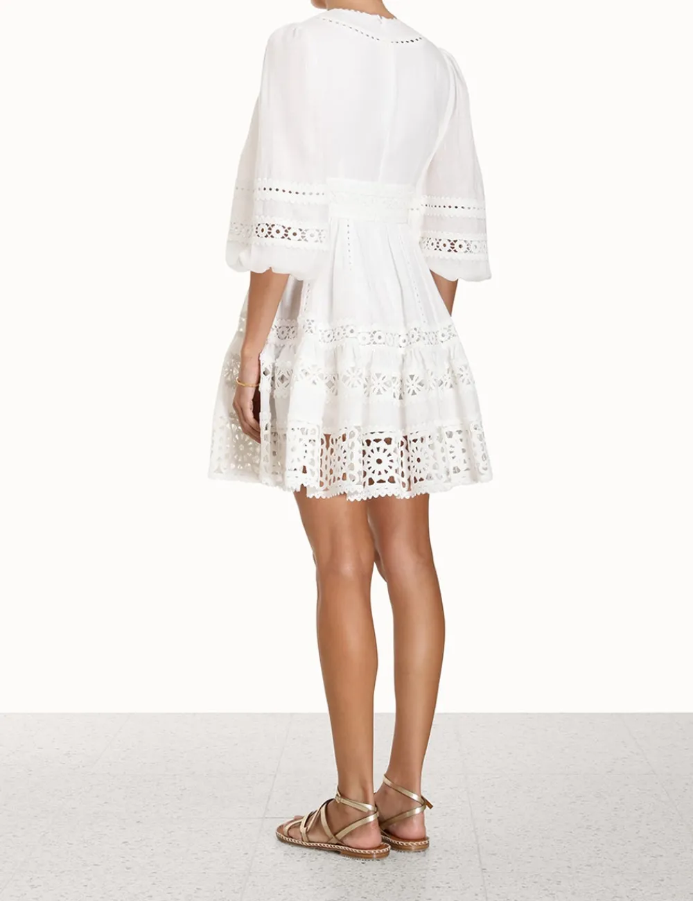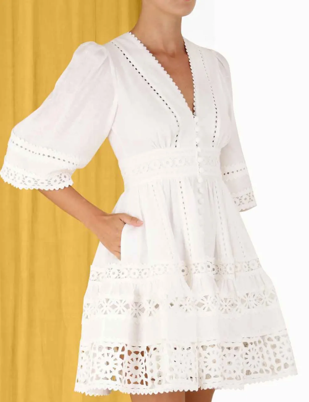 The Devi Spliced Billow Mini Dress In Ivory From Our Summer Swim 2023 Collection. A Spliced Linen Midi Dress Featuring A Gathered Drop Hem And Cutaway Crotchet Trims Throughout.