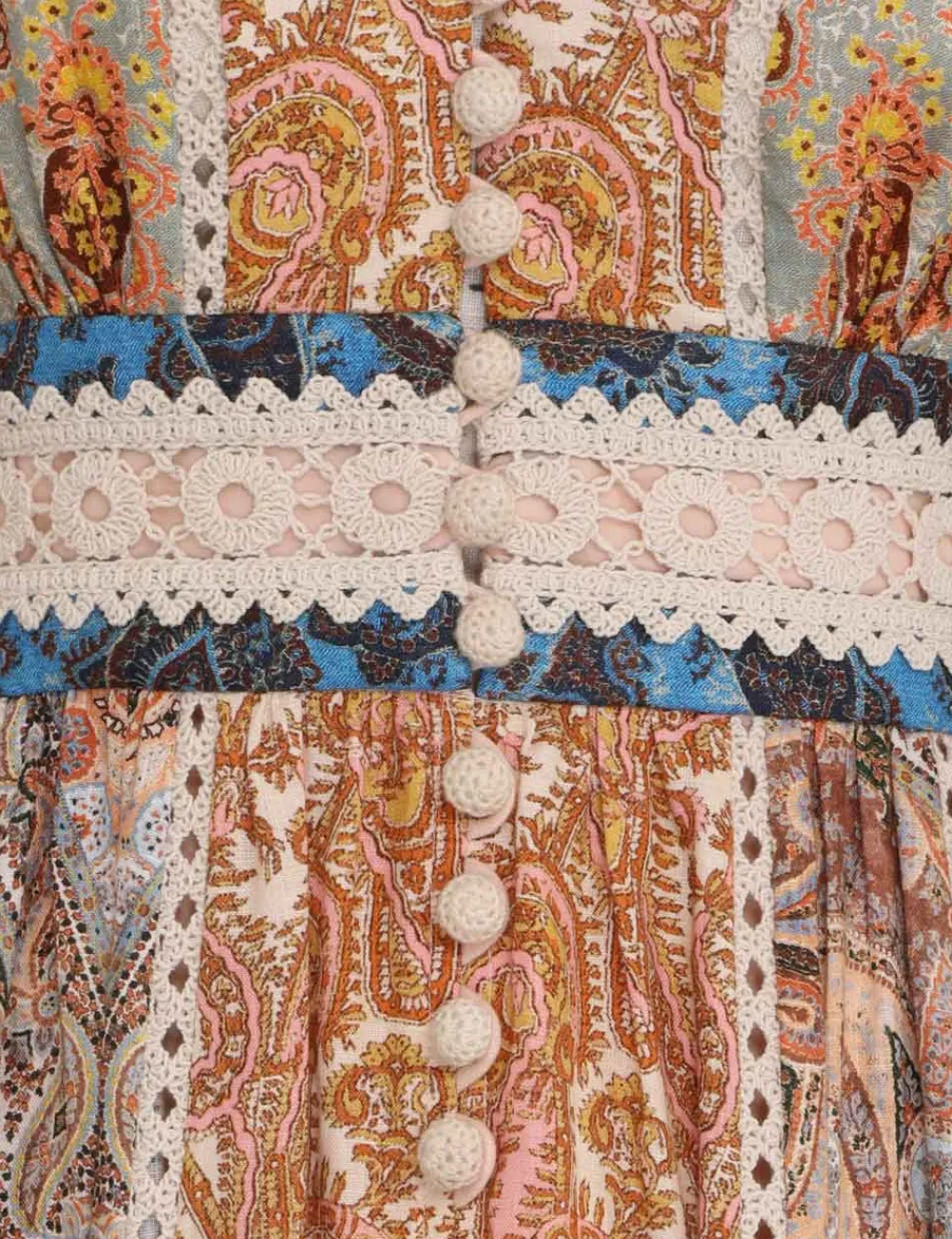 The Devi Spliced Midi Dress In Spliced Paisley From Our Summer Swim 2023 Collection. A Spliced Linen Midi Dress Featuring A Gathered Drop Hem And Cutaway Crotchet Trims Throughout.