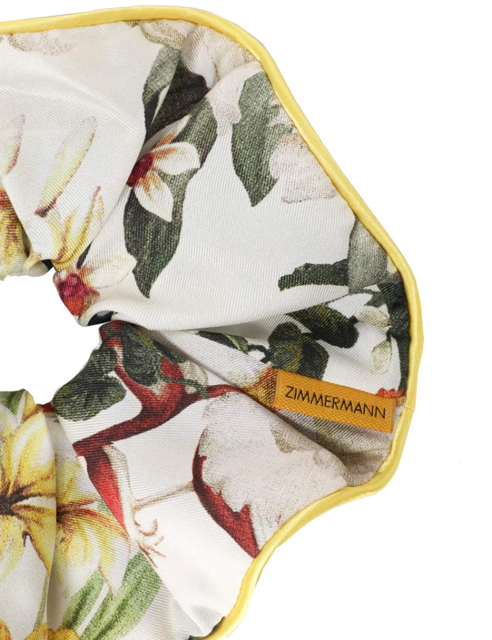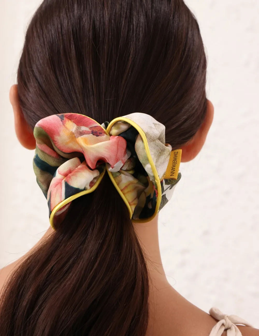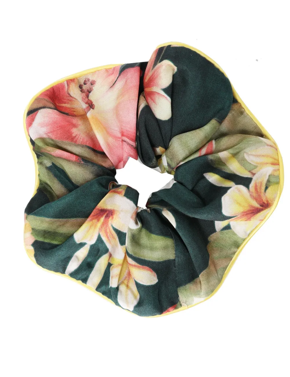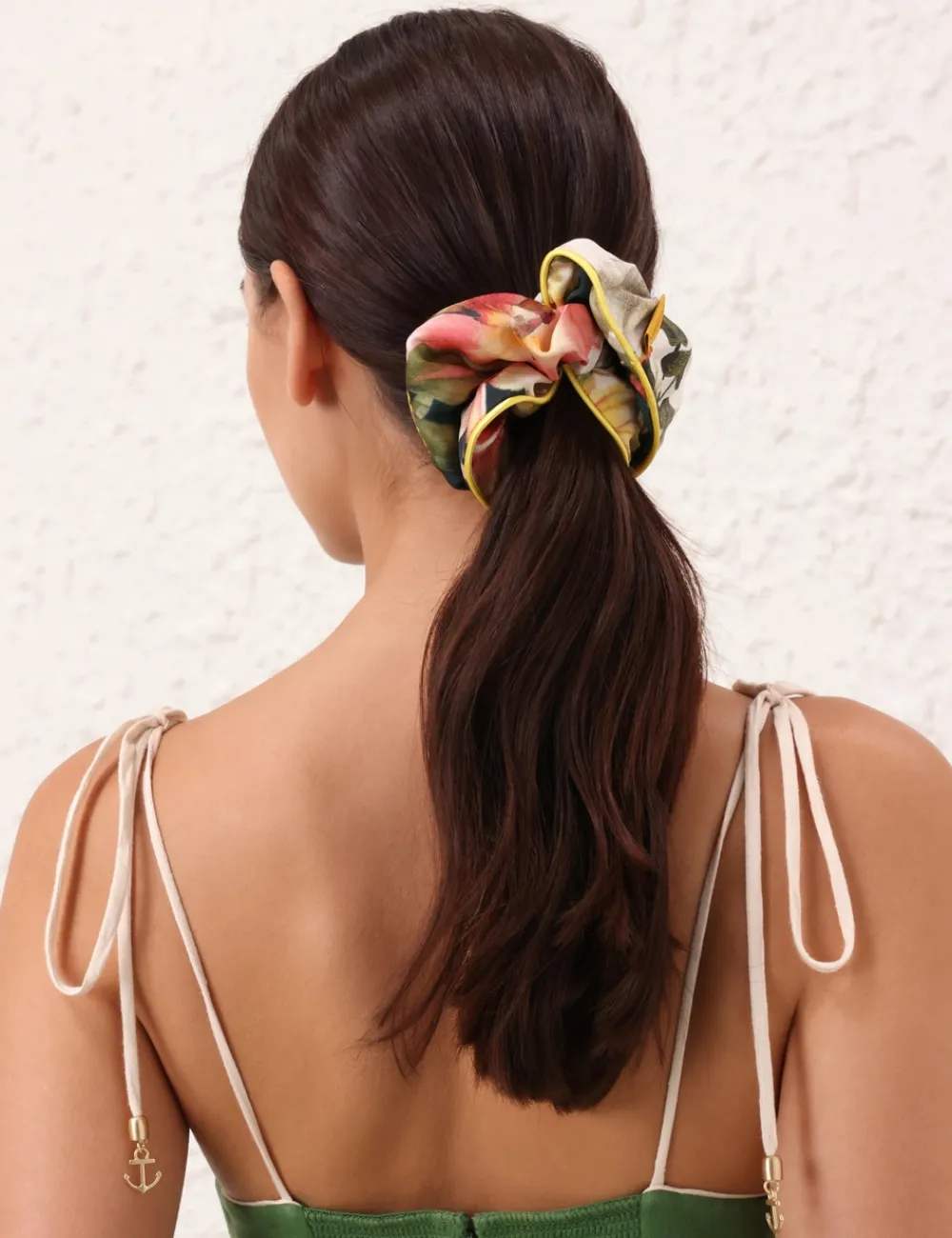 The Double Faced Silk Scrunchie In Ivory Palm From Our Resort 2024 Collection, Matchmaker. A Silk Scrunchie Featuring Contrast Piped Edges.