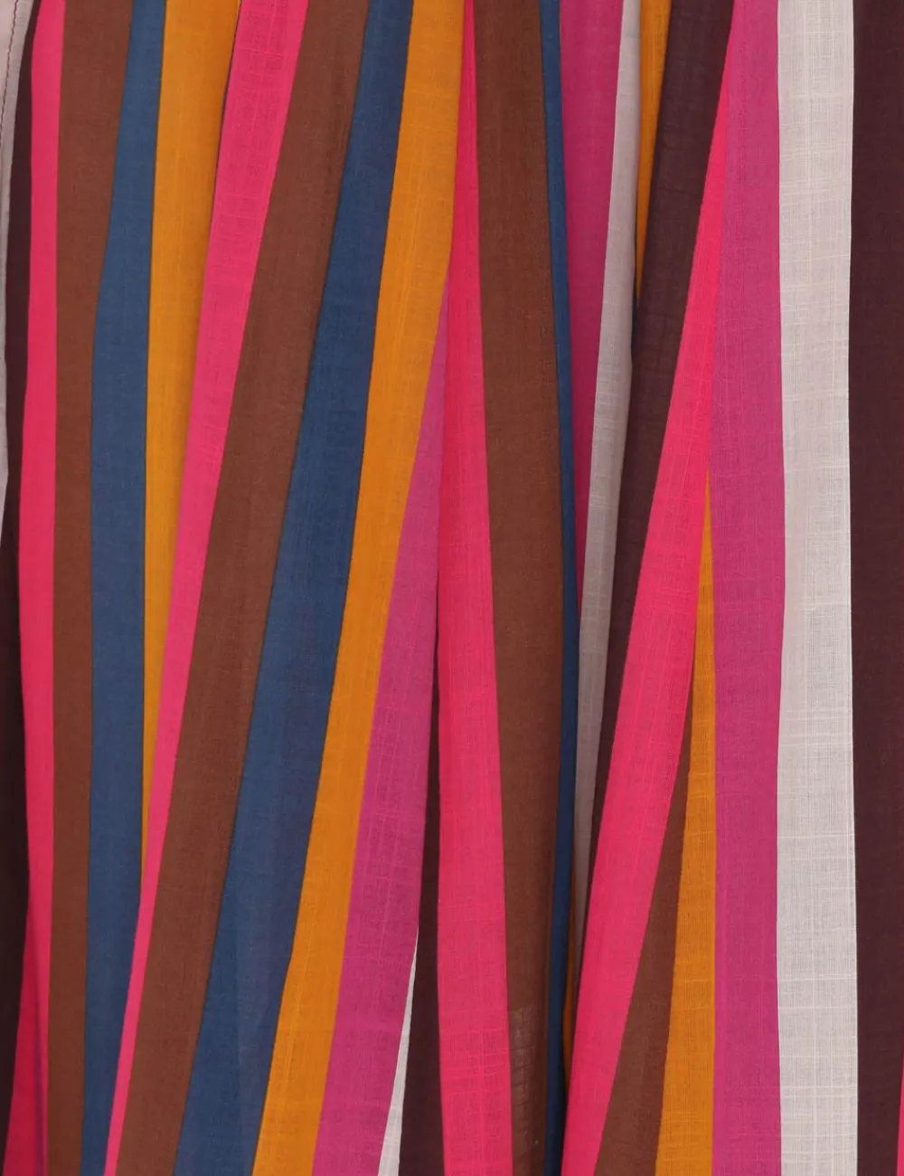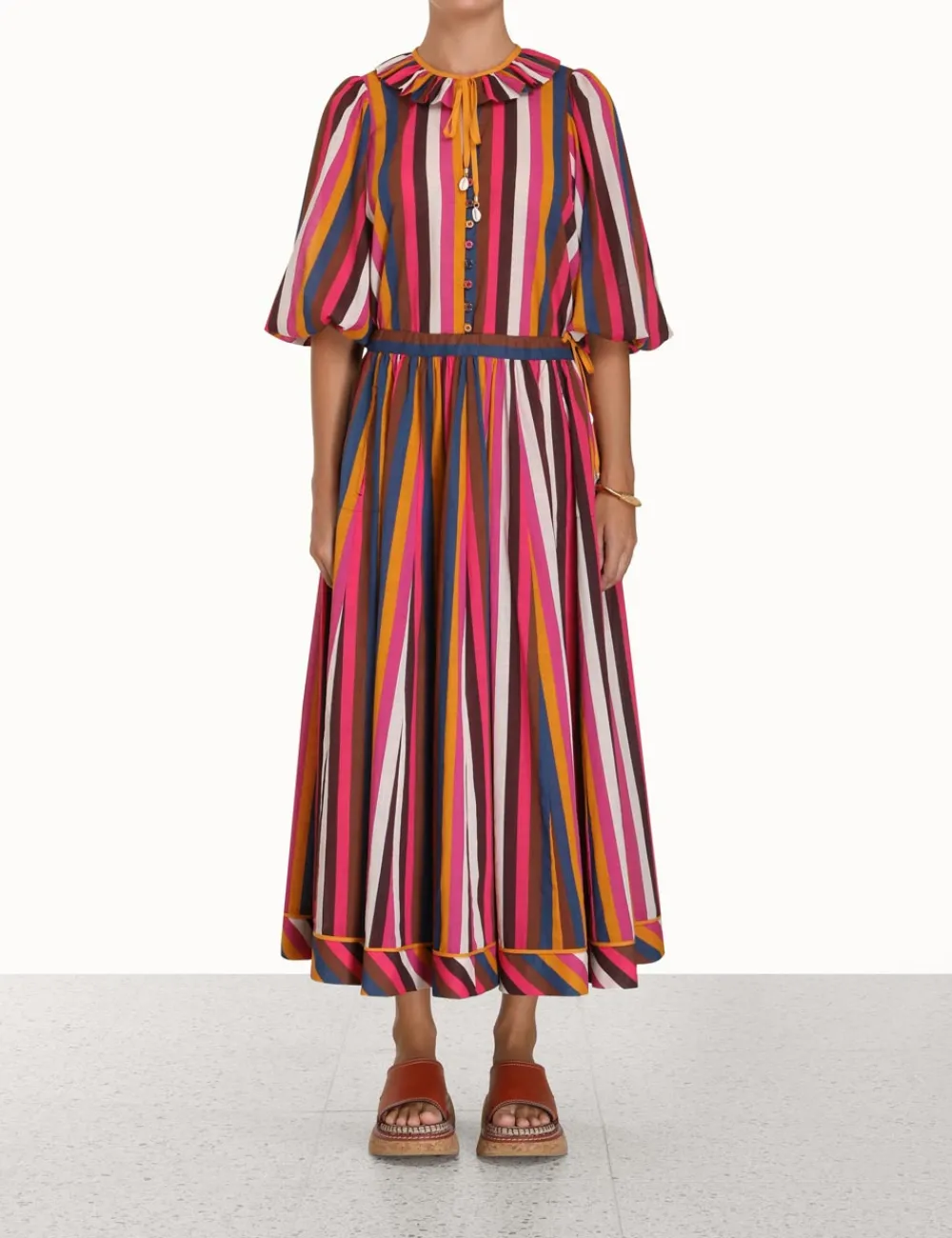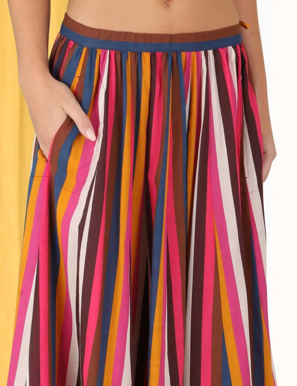 The Ginger Draw Flare Skirt In Multi Stripe From Our Summer Swim 2023 Collection. A Cotton Midi Skirt Featuring A Drawstring Waist And Side Pockets.