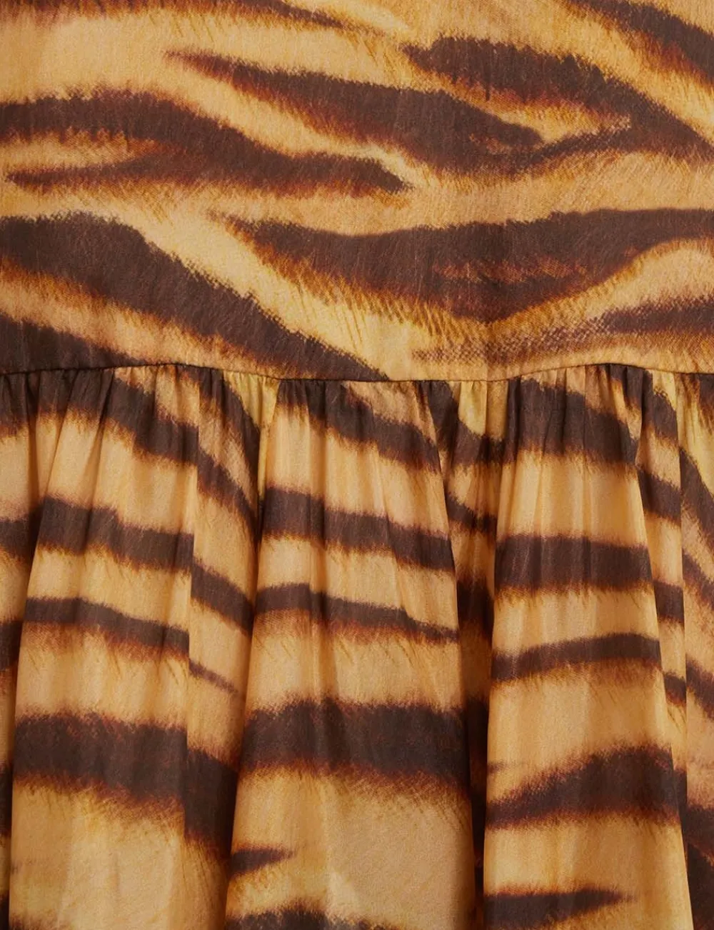 The Ginger Drop Waist Midi Dress In Tiger From Our Summer Swim 2023 Collection. A Silk Midi Dress Featuring A Drop Waist And Contrast Piped Edges.