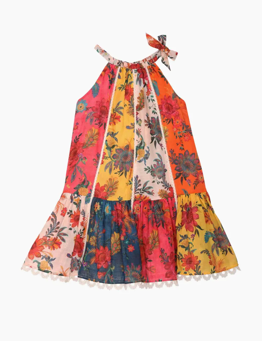 The Ginger Halter Dress In Spliced From Our Summer Swim 2023 Collection. A Cotton Dress With A Self Tie Halter Neck And Lace Inserts Throughout.