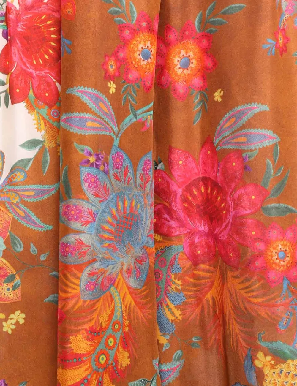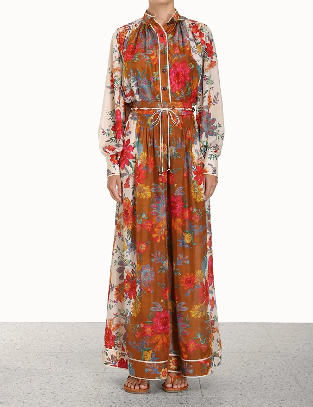 The Ginger Relaxed Pant In Cream/Brown Floralfrom Our Summer Swim 2023 Collection. A Silk Wide Leg Pant Featuring A Beaded Tie Belt And Contrast Piping Throughout.
