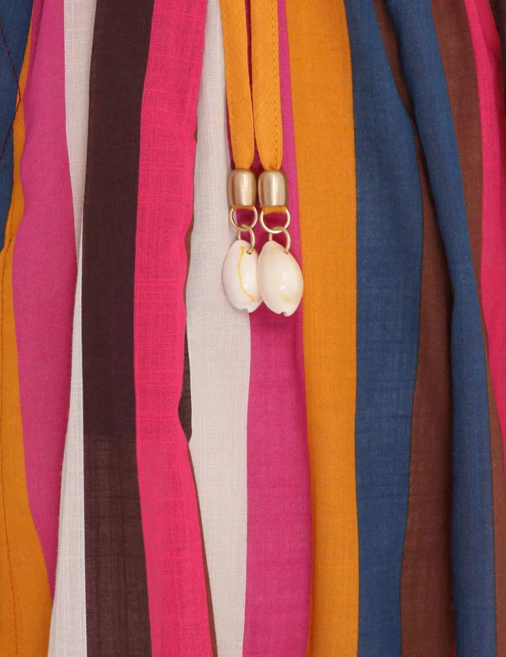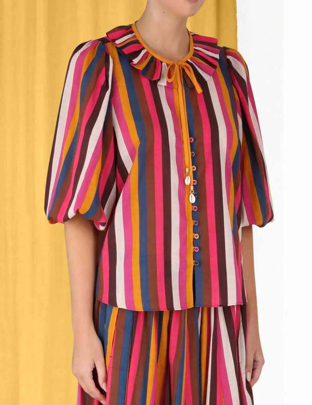 The Ginger Ruffle Neck Top In Multi Stripe From Our Summer Swim 2023 Collection. A Cotton Top Featuring Blouson Sleeves And A Ruffled Neckline.