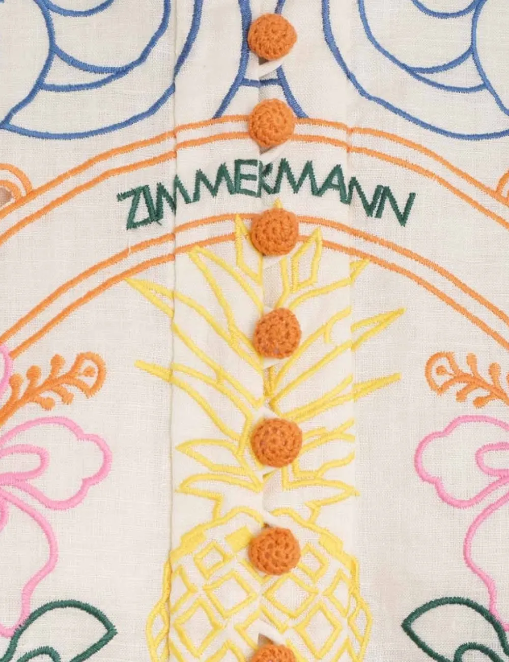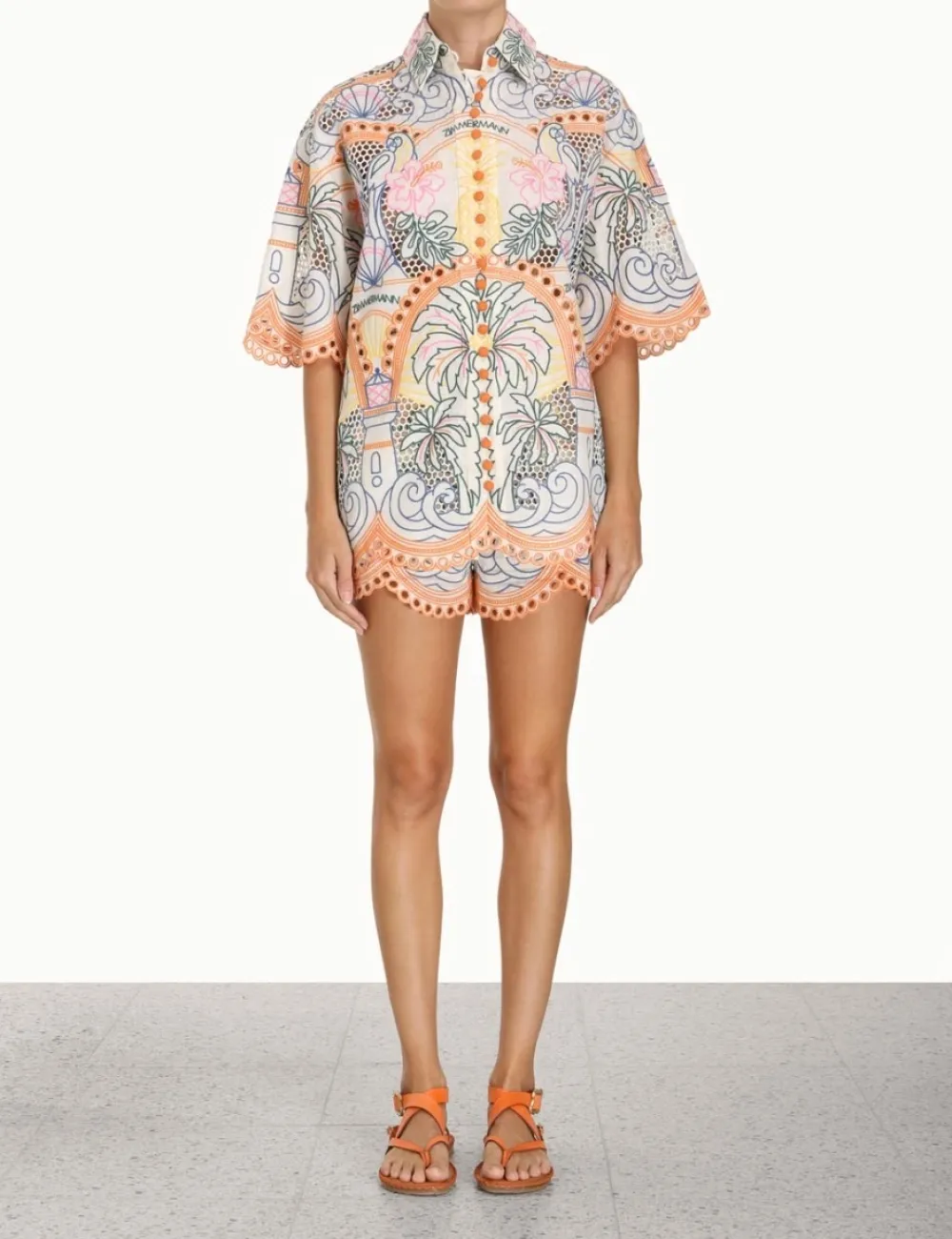 The Ginger Tropical Shirt In Multi From Our Summer Swim 2023 Collection. A Linen Broderie Anglaise Shirt Featuring Placement Embroidery Throughout And Contrast Edges.