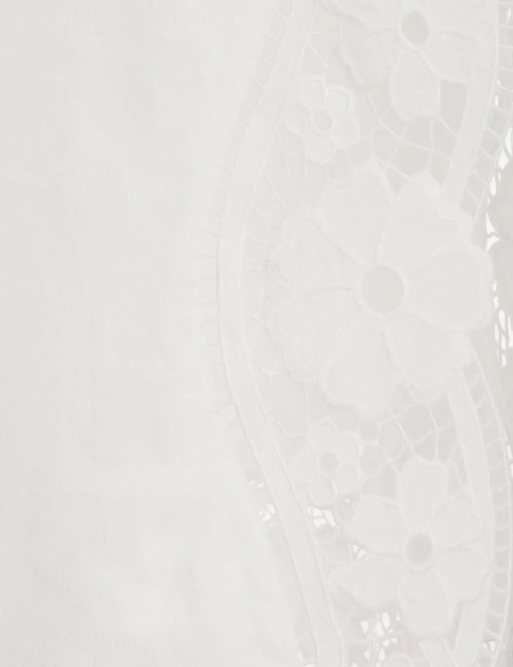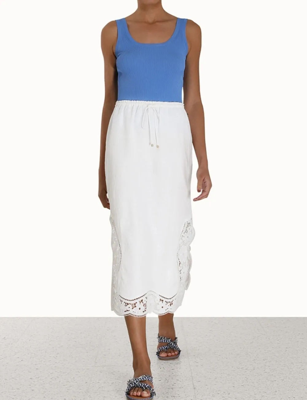 The Halcyon Broderie Skirt In Ivory From Our Summer Swim 2023 Collection. A Linen Midi Skirt Featuring Lace Applique Panels And A Scallop Hem.