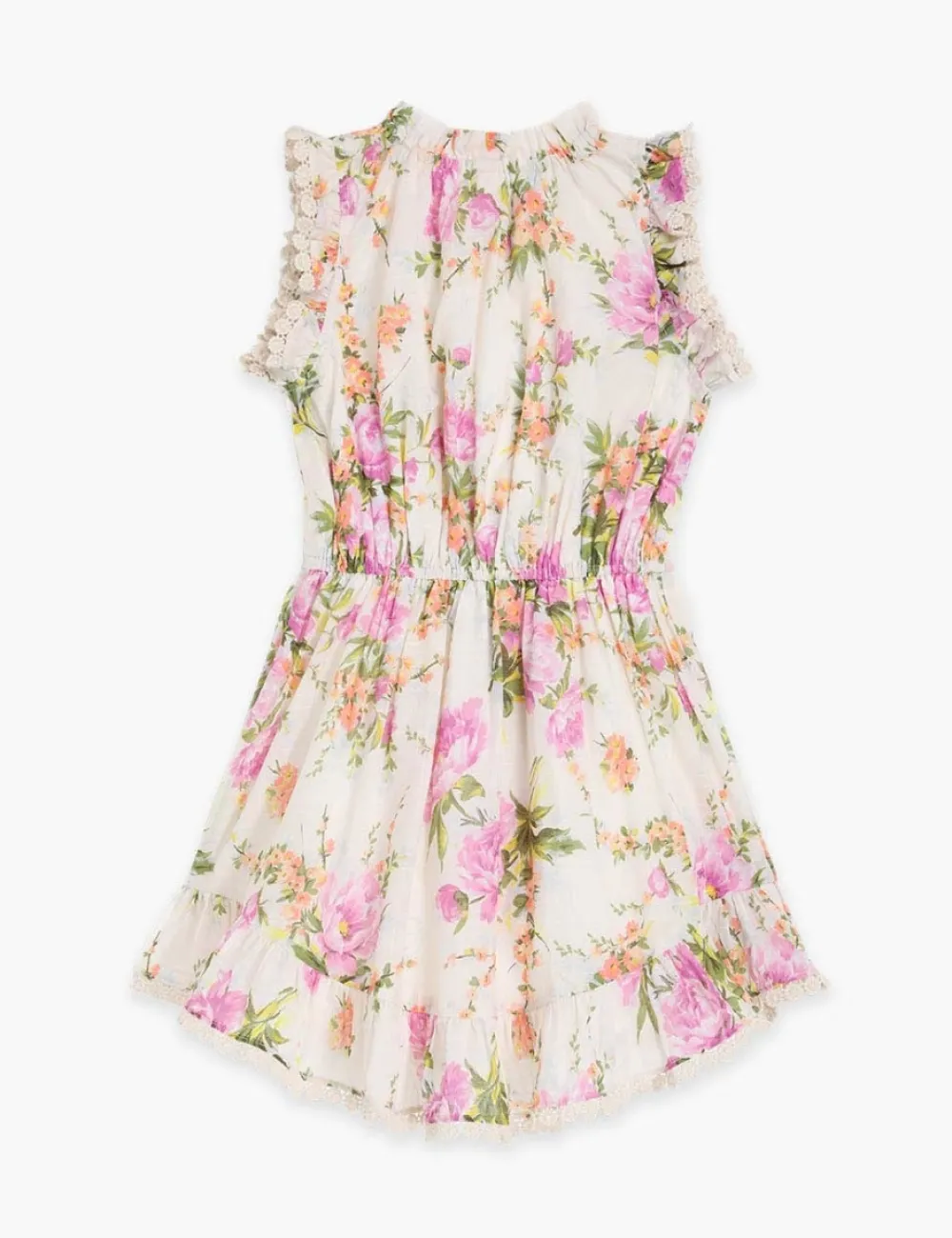 The Halcyon Flip Dress In Purple/Orange Floralfrom Our Summer Swim 2023 Collection. A Cotton Flip Dress Featuring A Playful Flip Hem With Gathered Frill Neckline And Sleeves.