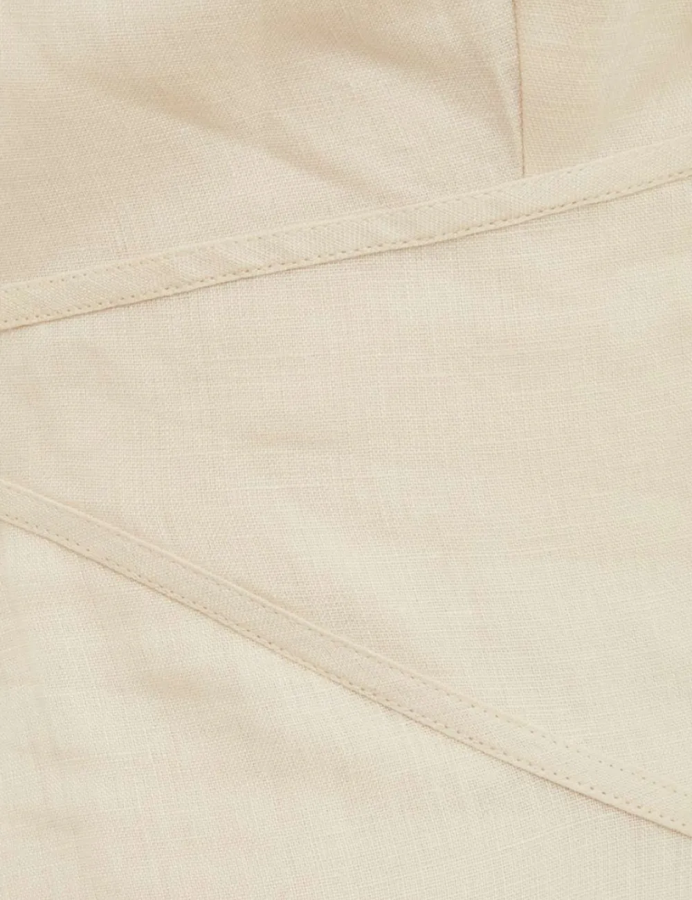 The Halcyon Flutter Midi Dress In Cream From Our Summer Swim 2023 Collection. A Linen Midi Dress Featuring Should Frills, Piping At Hems, And An A-Line Midi Skirt.
