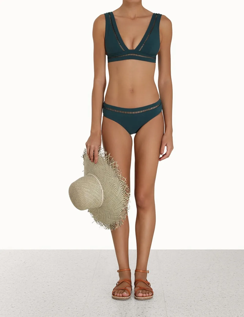 The Halcyon Ladder Trim Bikini In Teal From Our Summer Swim 2023 Collection. An Italian Lycra Bikini Set Featuring A Plunge, V-Neck Top With Wide Set Straps And Low Rise Bottoms, Finished With Ladder Insert Trims Throughout.