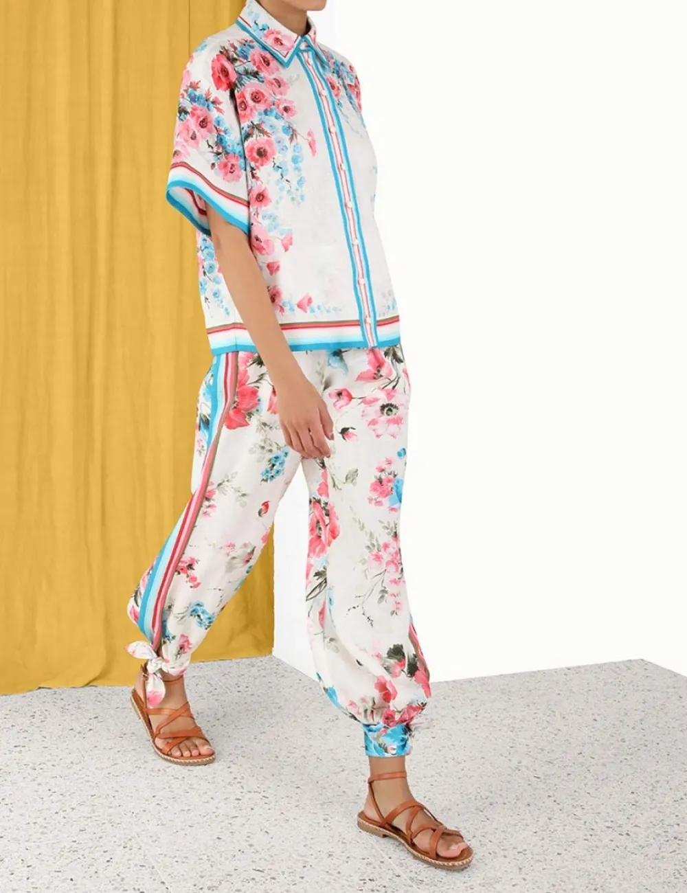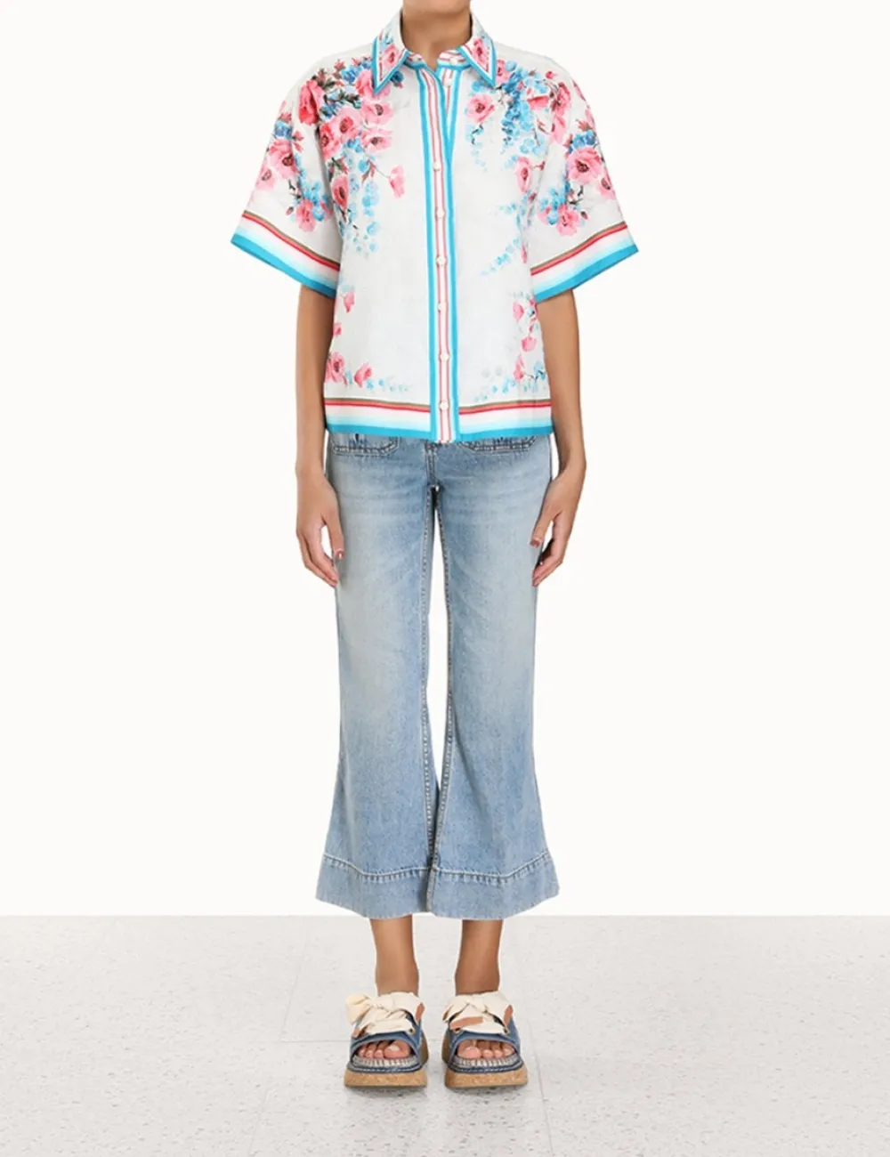 The Halcyon Oversized Shirt In Pink/Blue Floral From Our Summer Swim 2023 Collection. A Linen Shirt Featuring An Oversized Silhouette With Classic Shirt Shaping And A Placement Print Throughout.