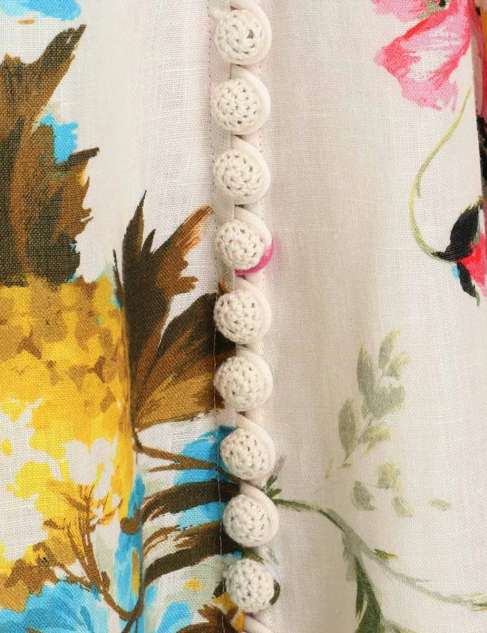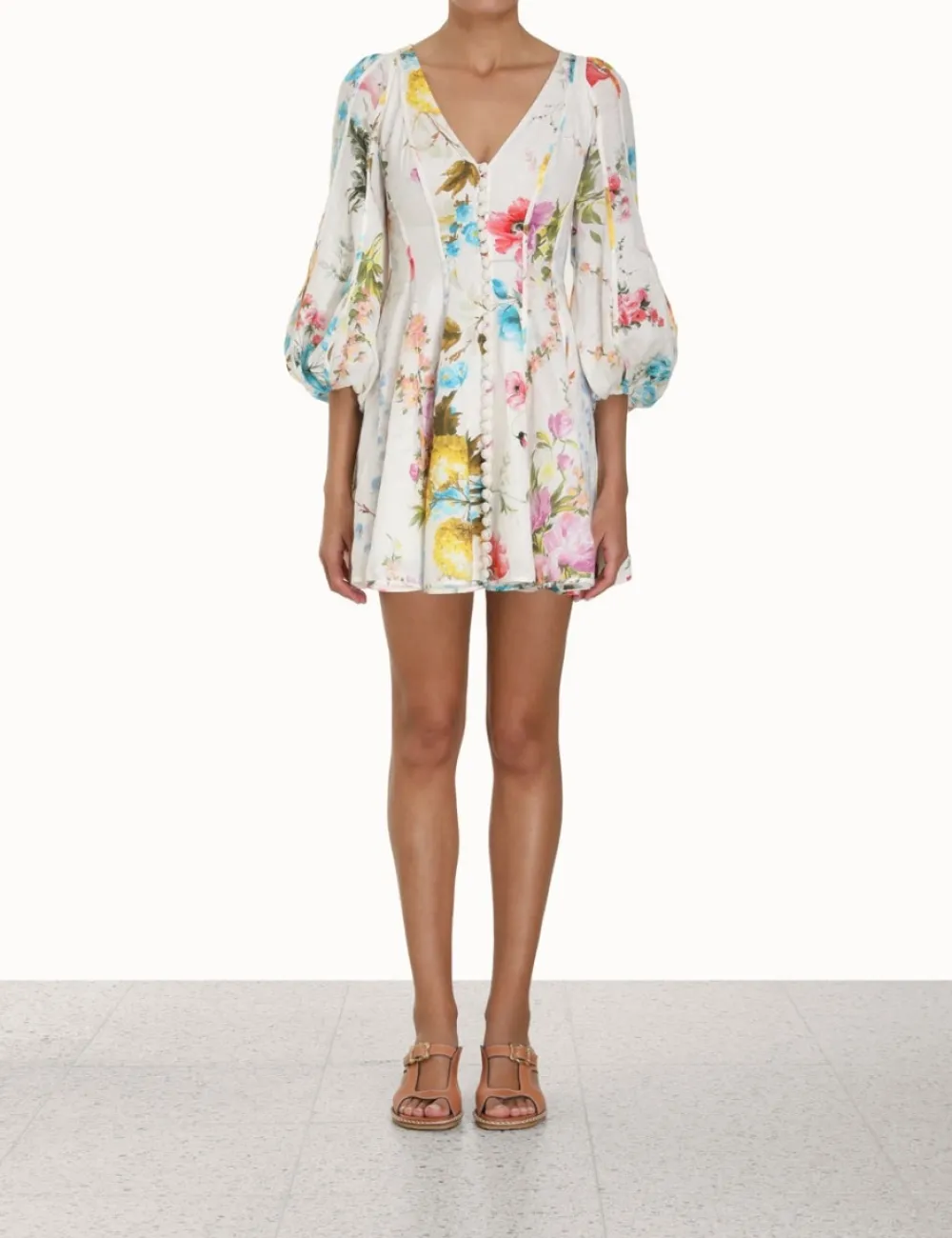 The Halcyon Panelled Mini Dress In Spliced From Our Summer Swim 2023 Collection. A Linen Mini Dress Featuring Exaggerated Sleeves And Buttons Down The Centre Front.