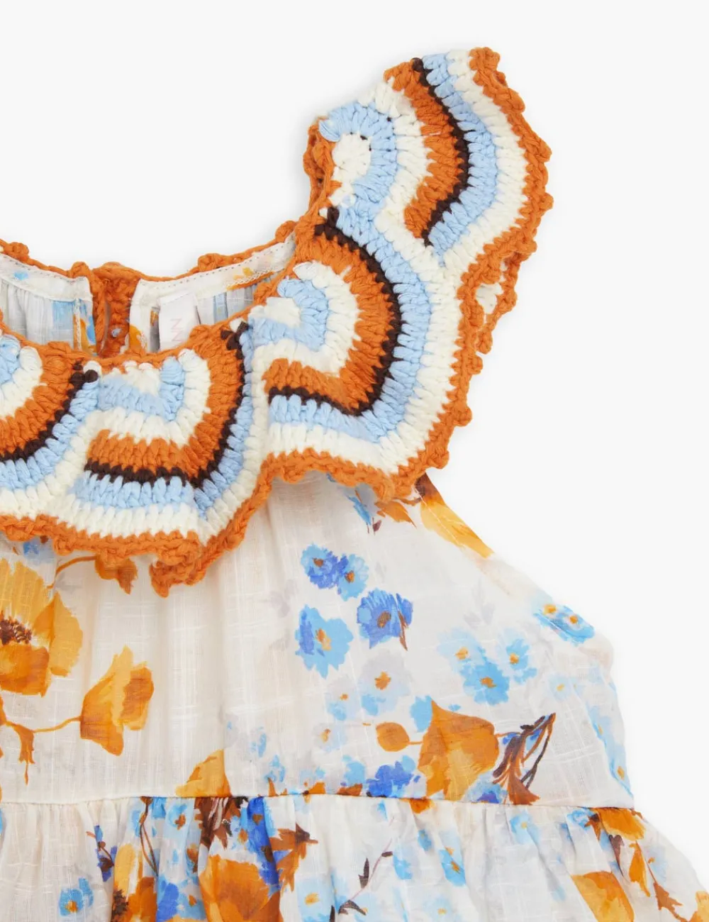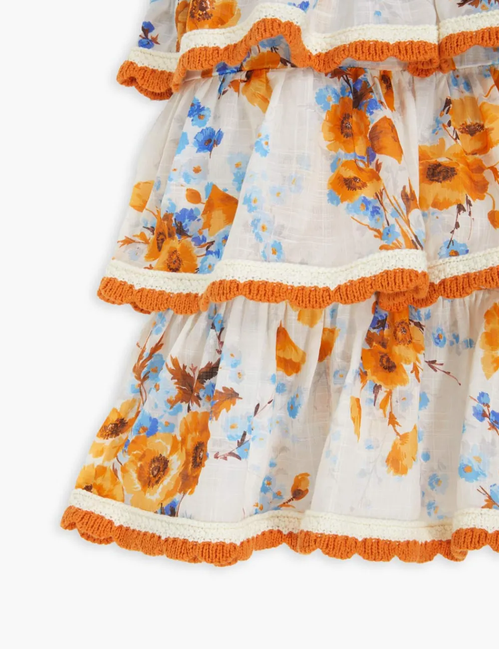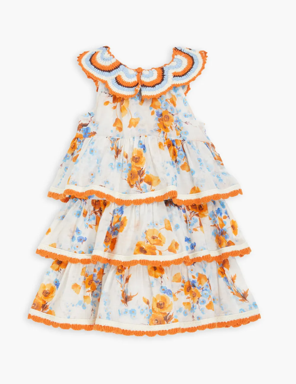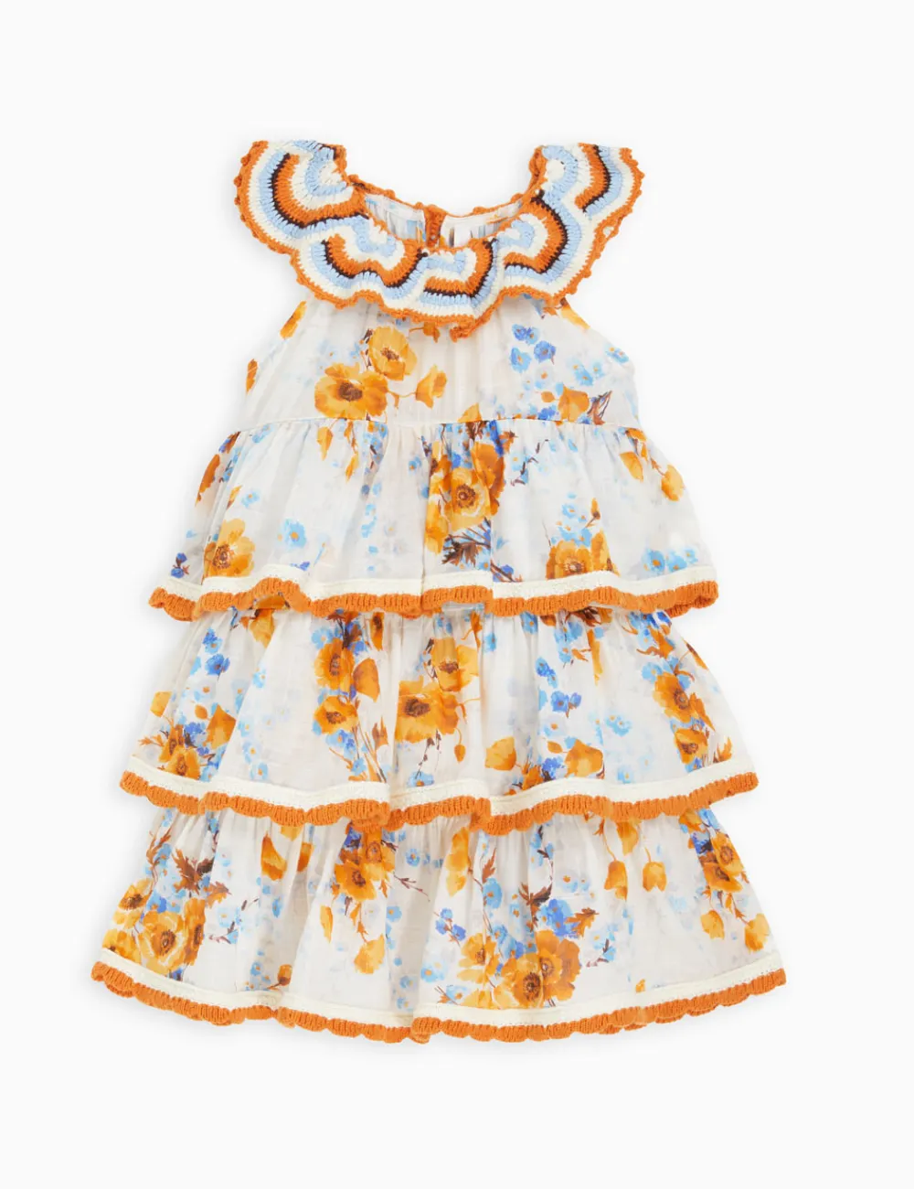 The Halcyon Scallop Crochet Dress In Multi From Our Summer Swim 2023 Collection. A Cotton Dress Featuring Scalloped Tiers And Contrast Crochet Frills Along The Neckline.