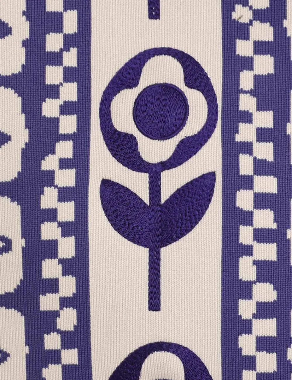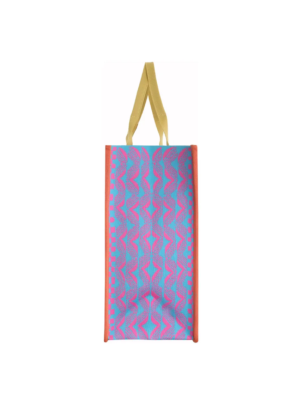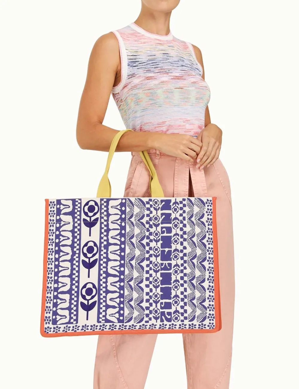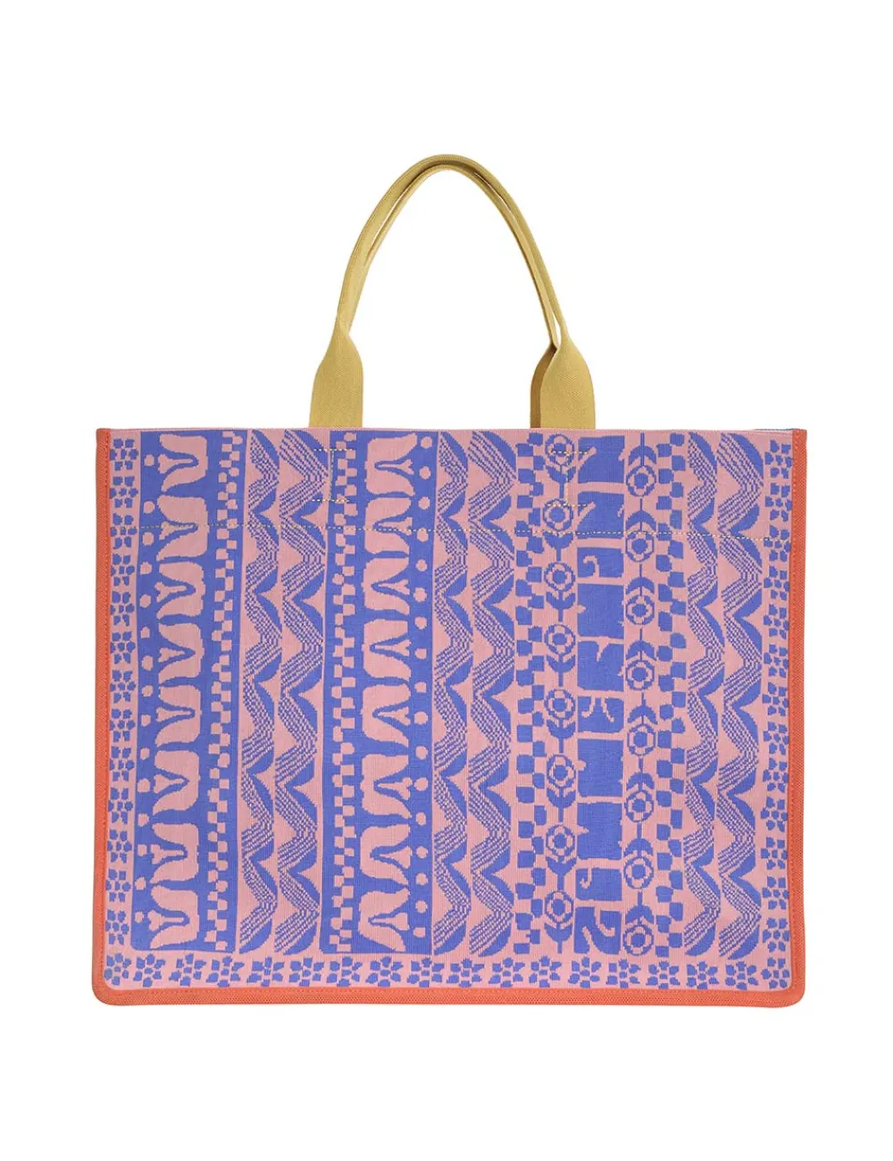 The Jacquard Tote In Blue Geo From Our Summer Swim 2023 Collection. A Large Tote Bag Featuring An Interior Pocket And Snap Button Closure.