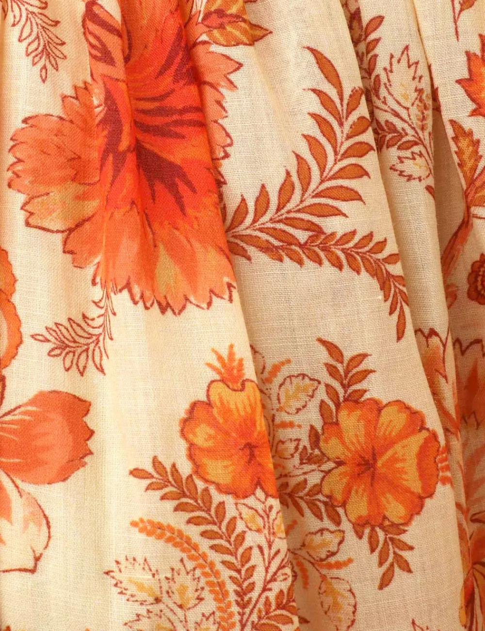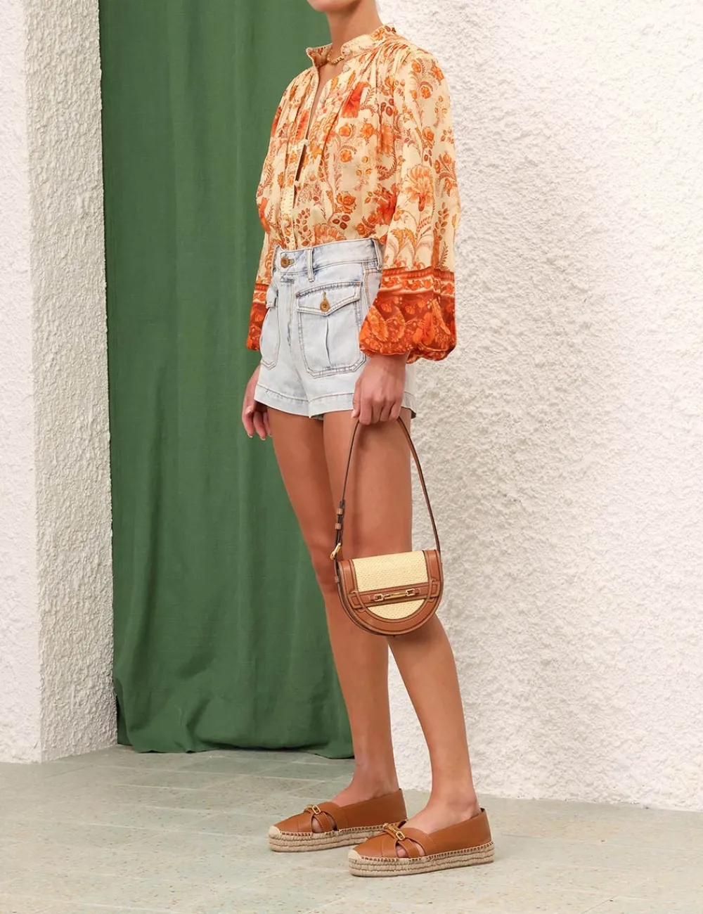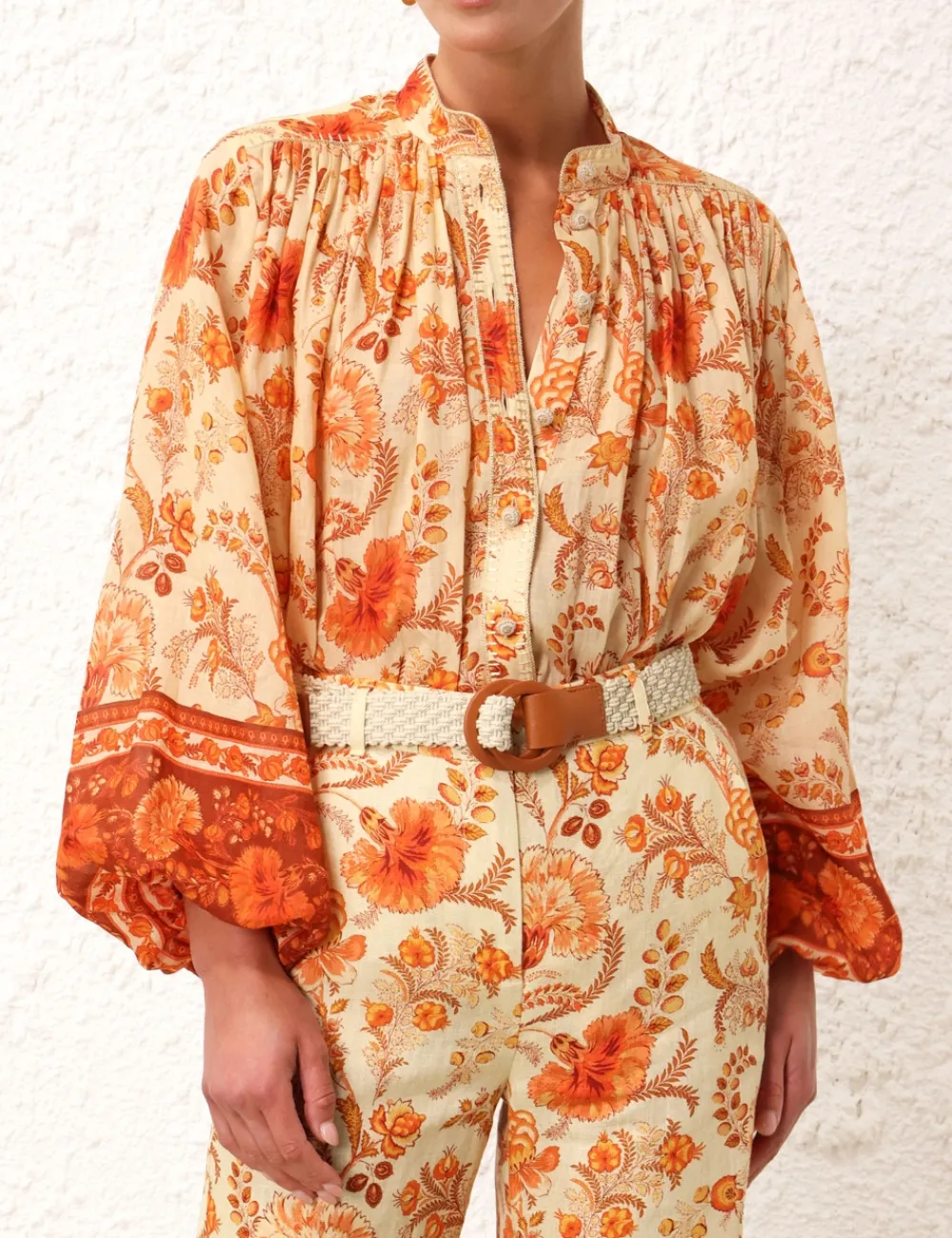 The Junie Billow Blouse In Cream/Tan Floral From Our Resort Swim 2024 Collection. A Printed Long Sleeve Blouse Featuring Buttons Down The Centre Front, Gold Lurex Crochet Edging And Pleats Along The Neckline.