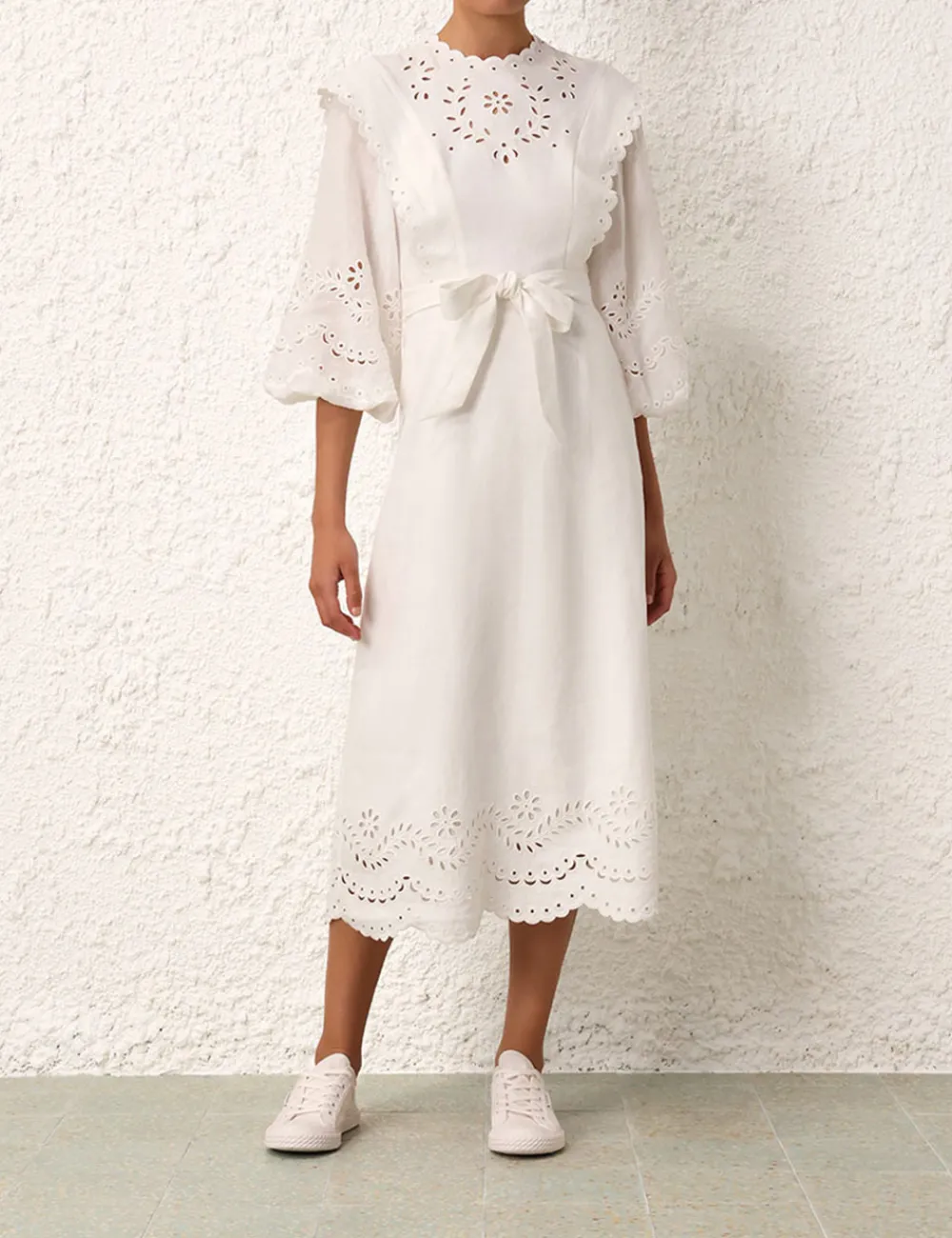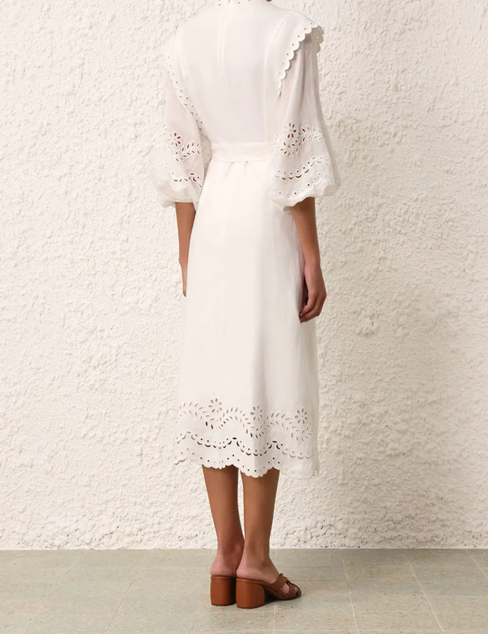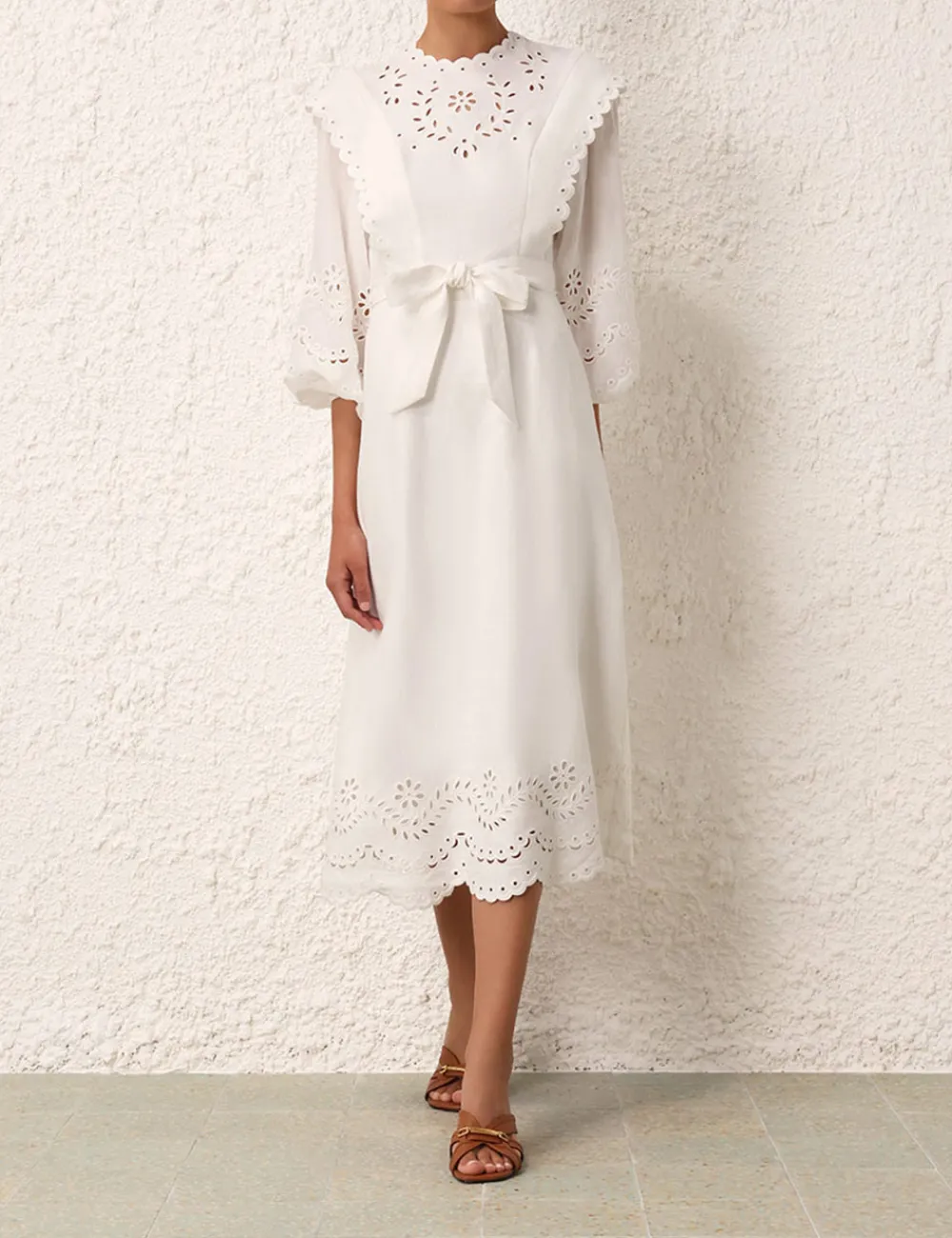 The Junie Embroidered Midi Dress In Ivory From Our Resort Swim 2024 Collection. A Linen Midi Dress Featuring Placement Scalloped Embroidery, Elasticated Sleeve Cuffs And A Removable Waist Tie.