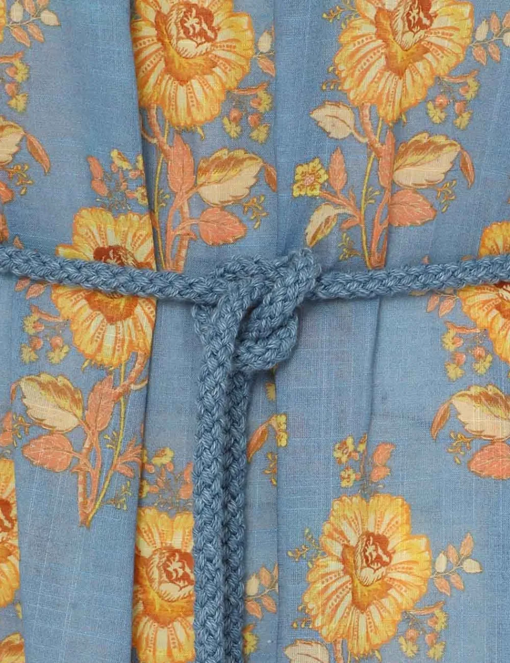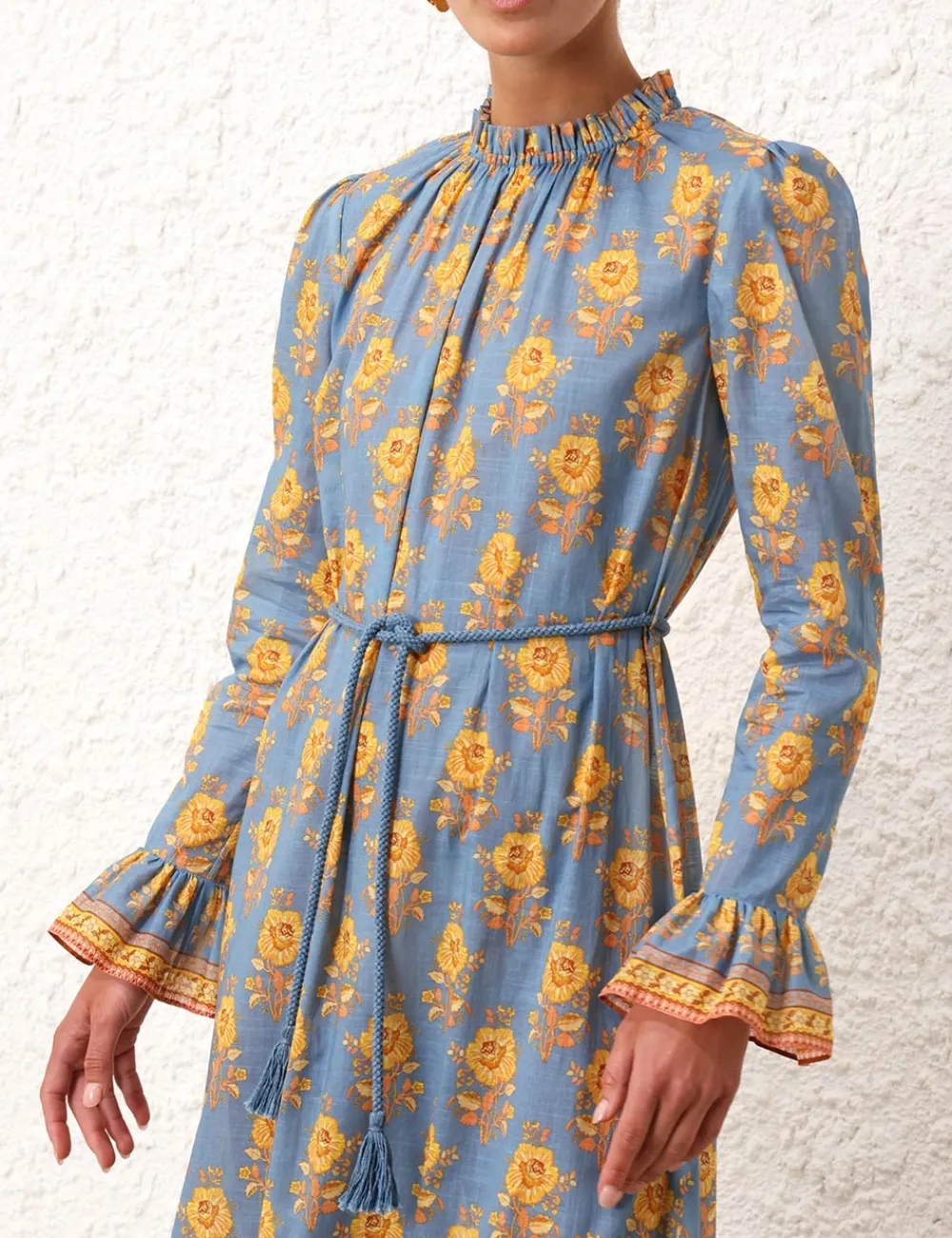 The Junie Frill Midi Dress In Blue/Yellow Floral From Our Resort Swim 2024 Collection. A Cotton Midi Dress Featuring A Self Tie Waist And A Frilled Neckline, Drop Hem And Cuffs.
