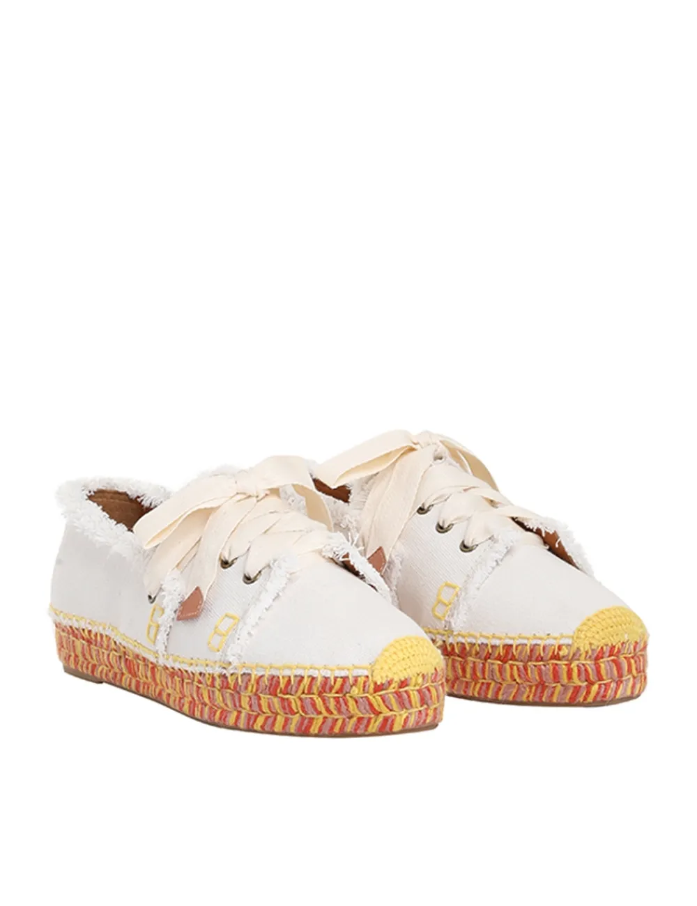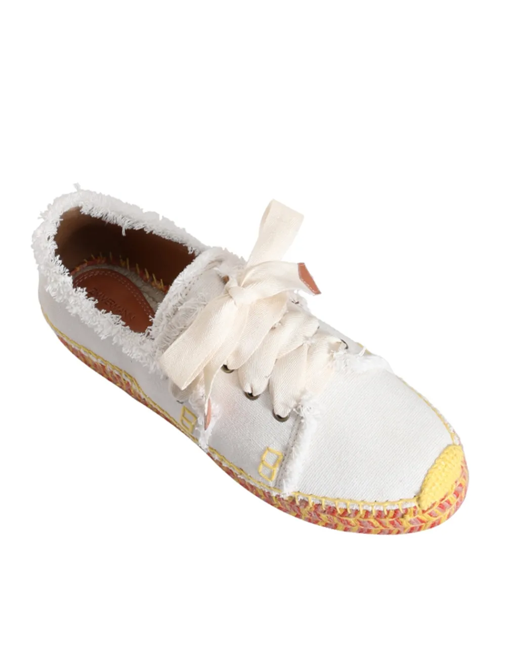 The Lace Up Espadrille Derby In Off White From Our Summer Swim 2023 Collection. A Canvas Espadrille Featuring Frayed Panel Edges.