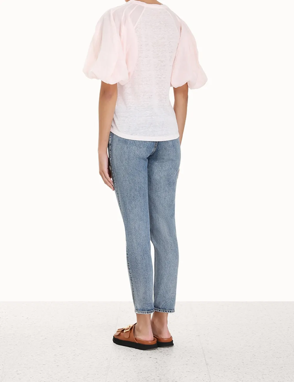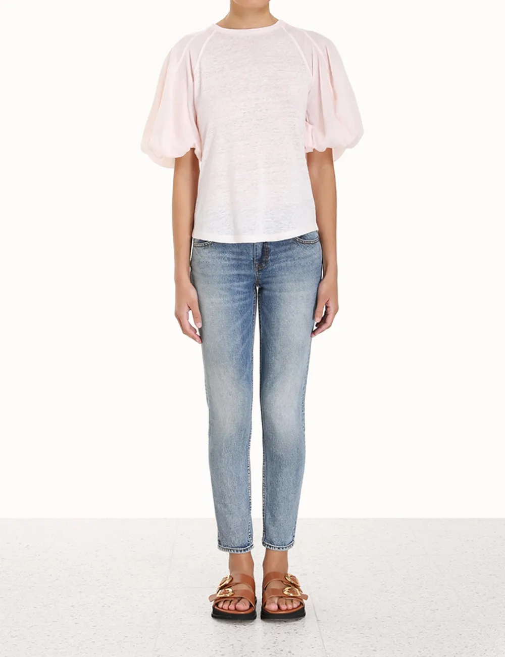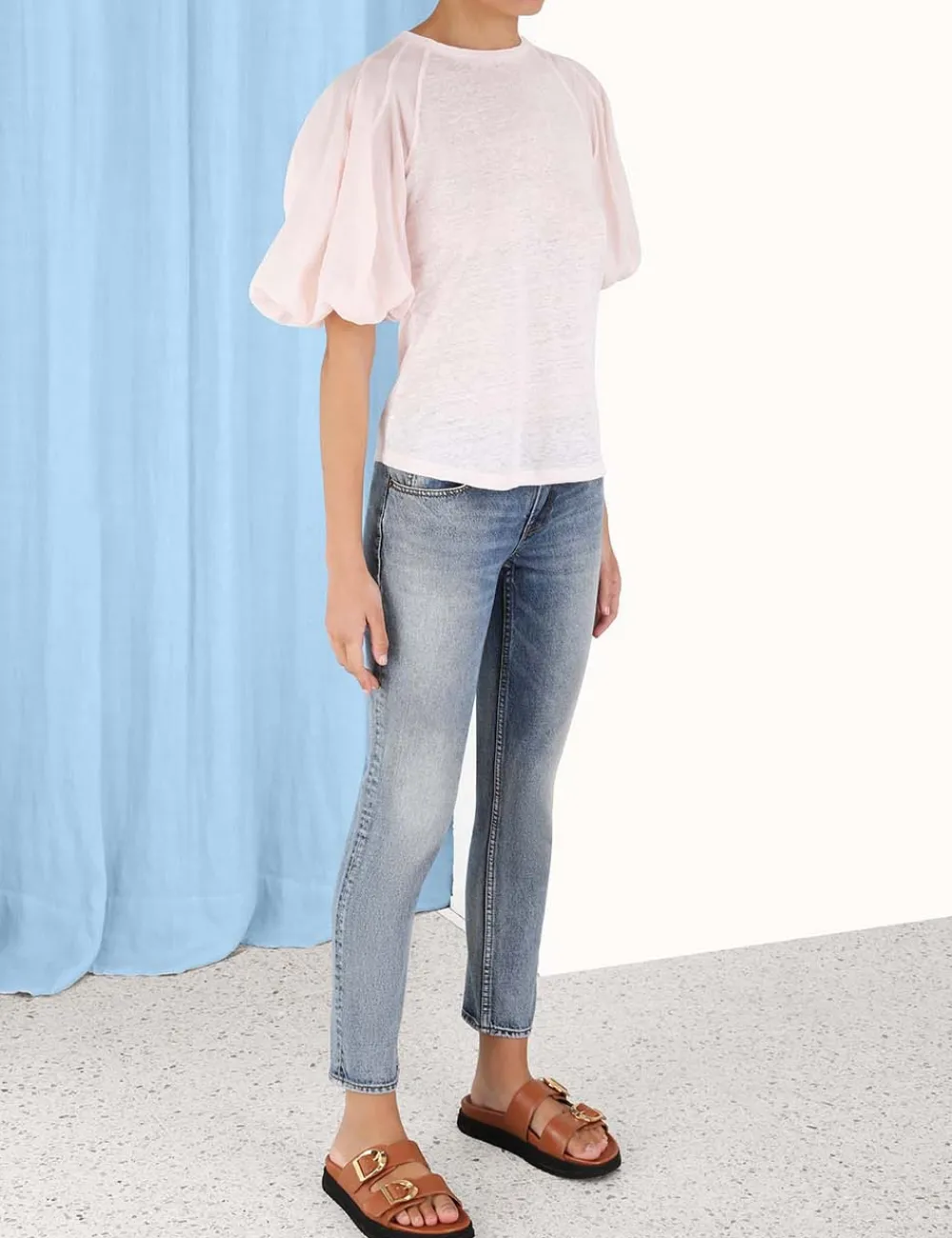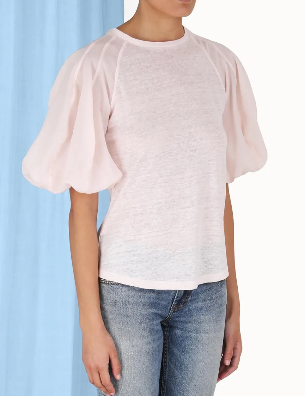 The Lantern Sleeve Tee In Blush From Our Fall 2023 Collection, Luminosity. A Linen Tee Featuring Short Blouson Sleeves.