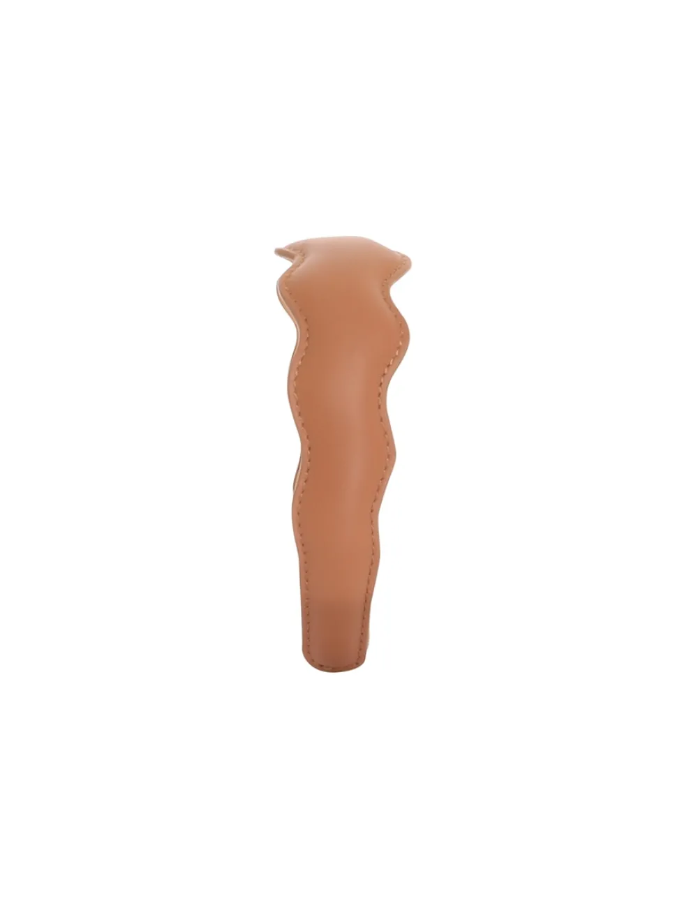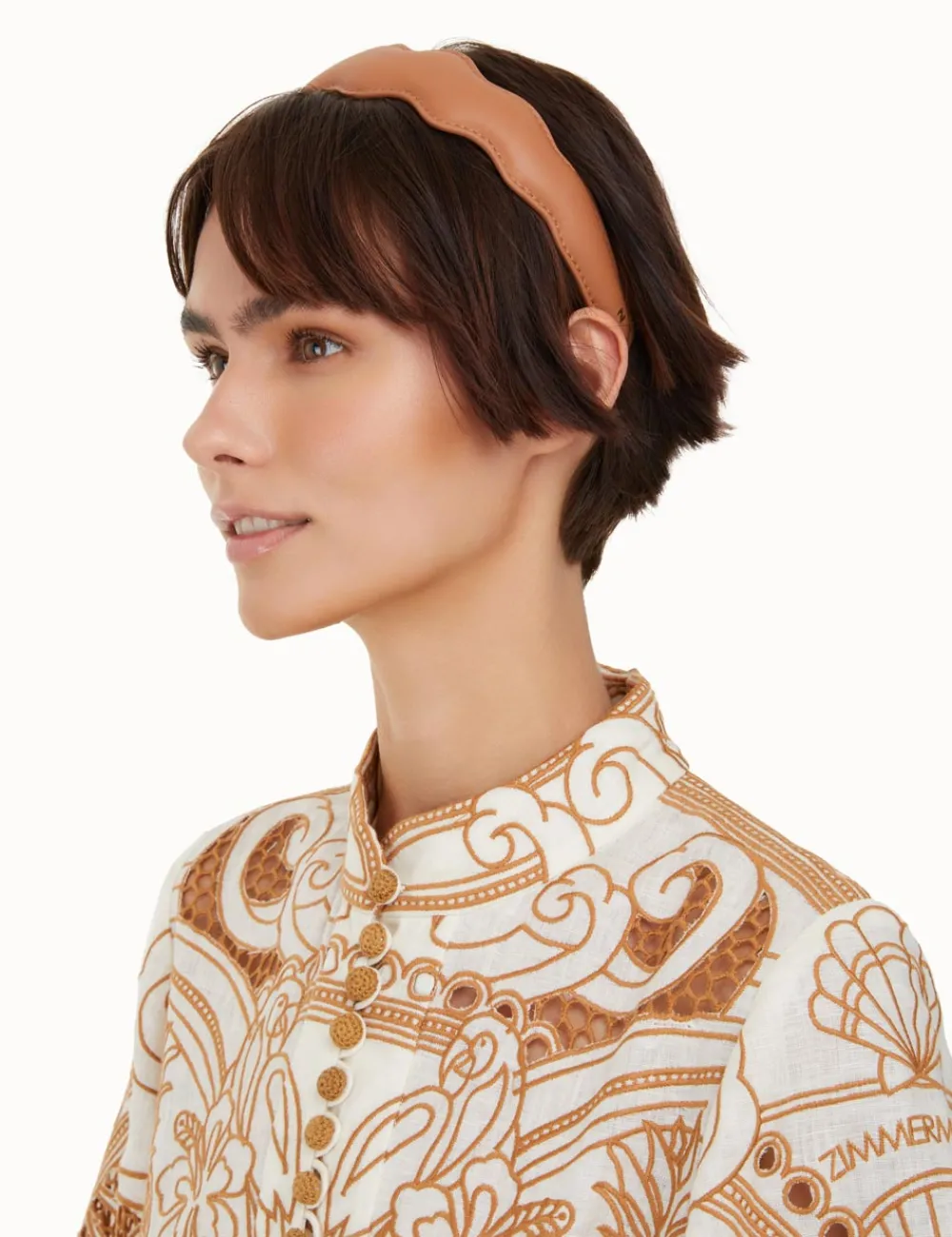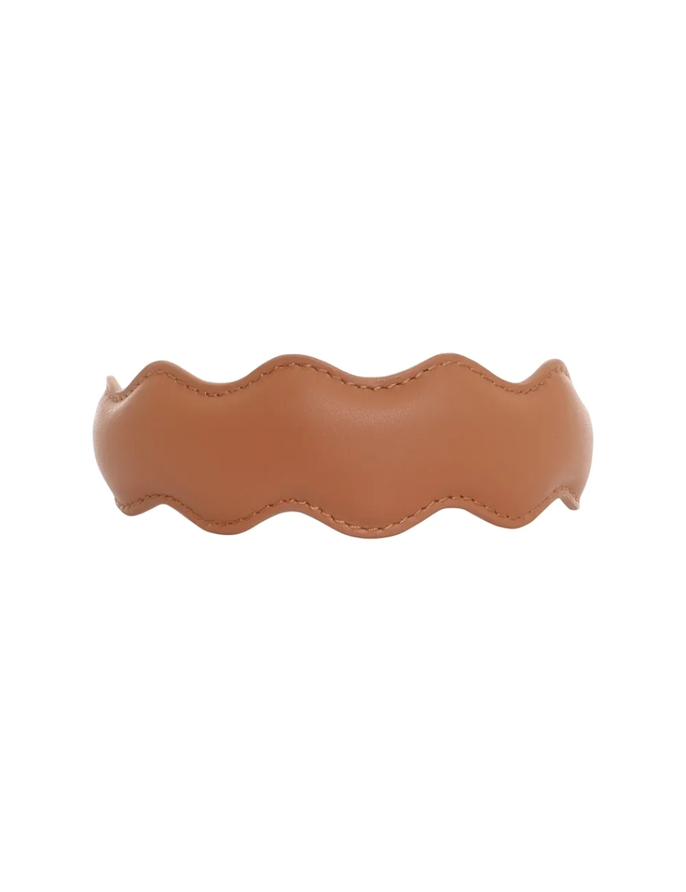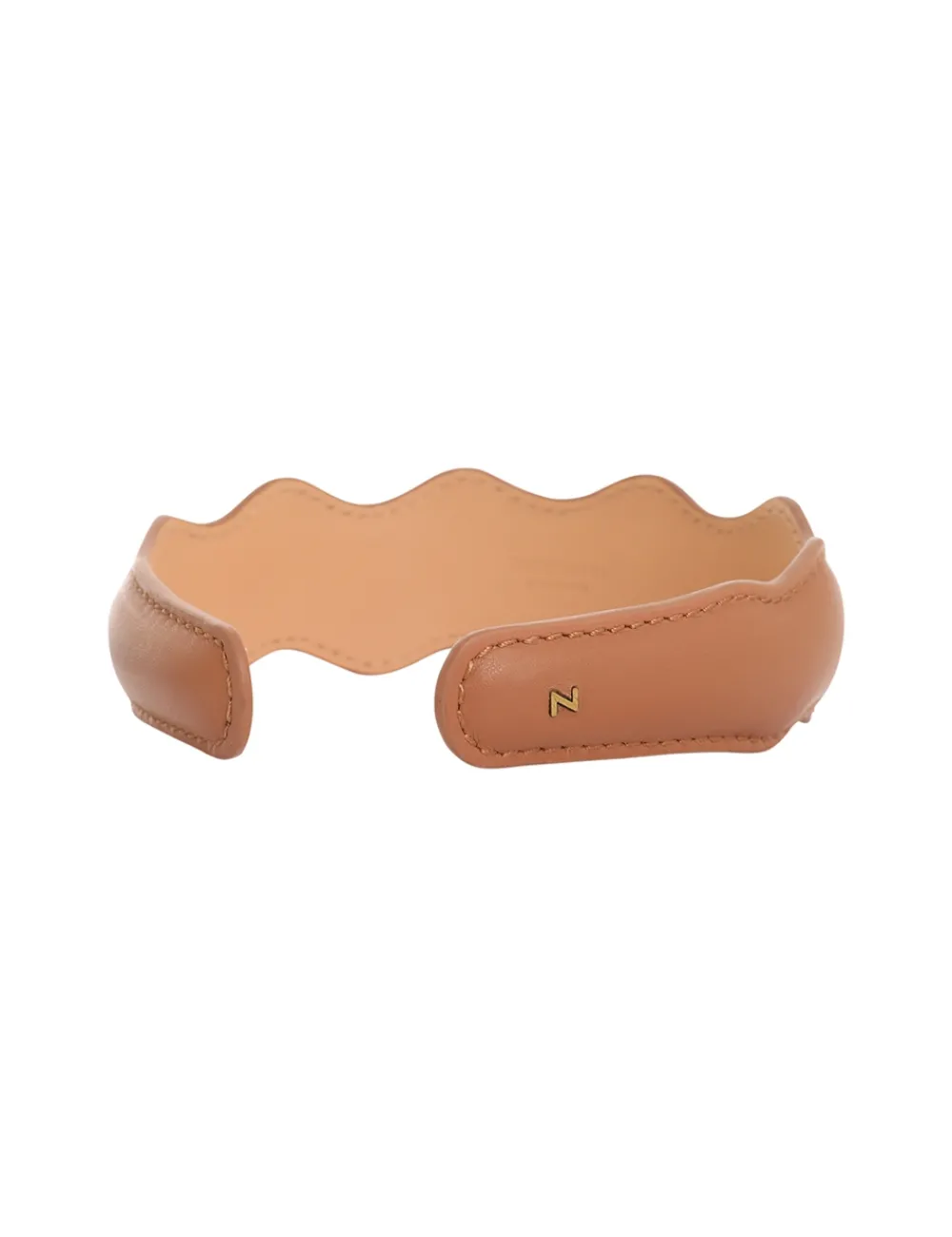 The Leather Wave Headband In Tan From Our Summer Swim 2023 Collection. A Headband Featuring Scalloped Edges And Topstitching Throughout.
