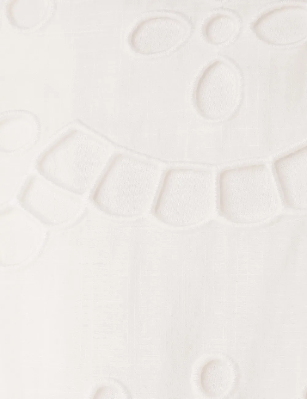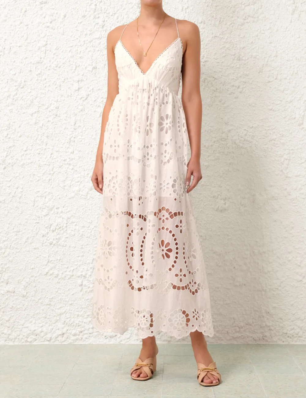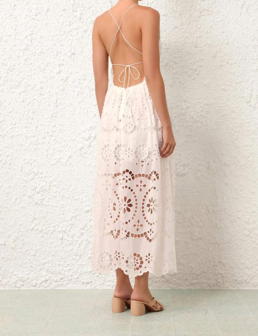 The Lexi Embroidered Slip Dress In Ivory From Our Resort Swim 2024 Collection. A Cotton Slip Dress Featuring A Plunging Neckline, Embroidery And A Lace Scallop Hem.