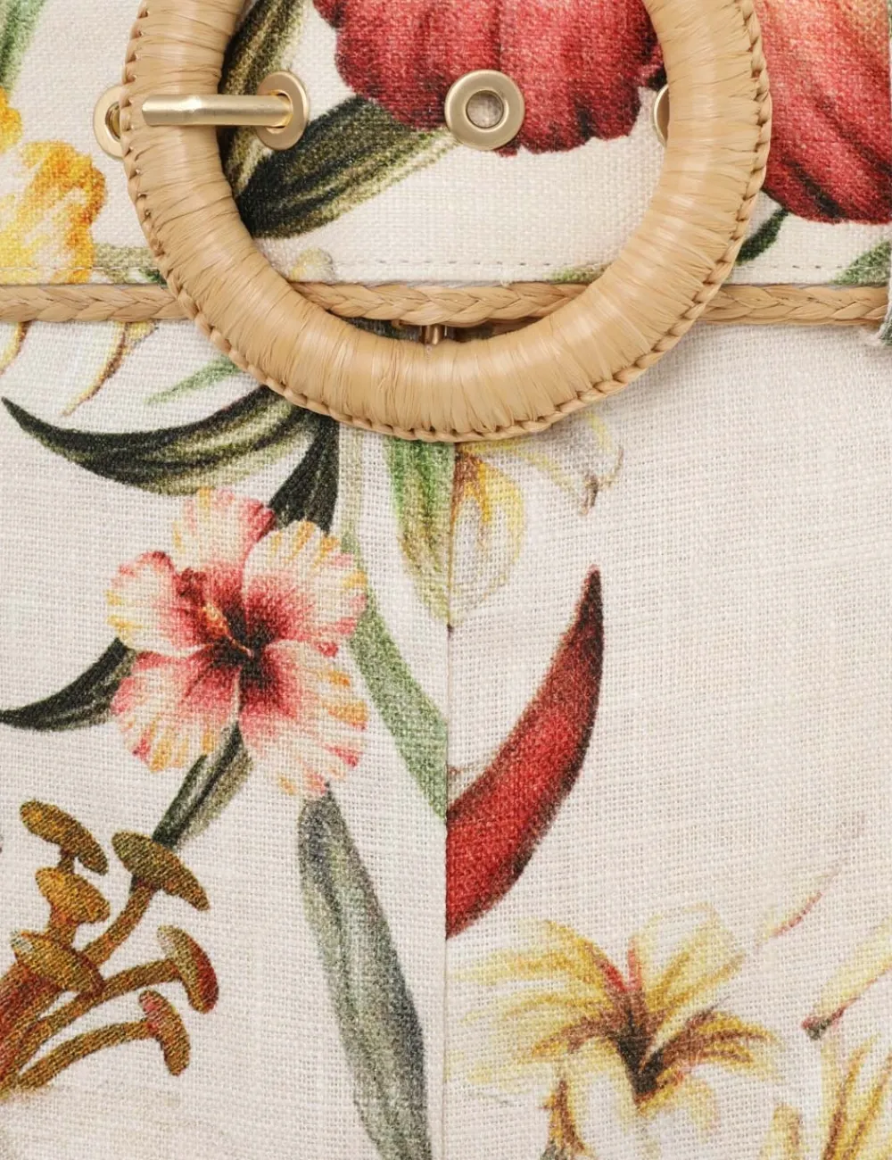 The Lexi Fitted Short In Ivory Palm From Our Resort Swim 2024 Collection. A Linen High Waisted Short Featuring A Raffia Trim Along The Belt Edge And Hem.