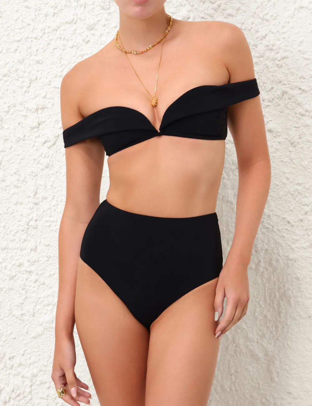 The Lexi Off Shoulder Bikini In Noir From Our Resort Swim 2024 Collection. A Lycra Bikini Featuring An Off Shoulder Bra And A High Waisted Pant.