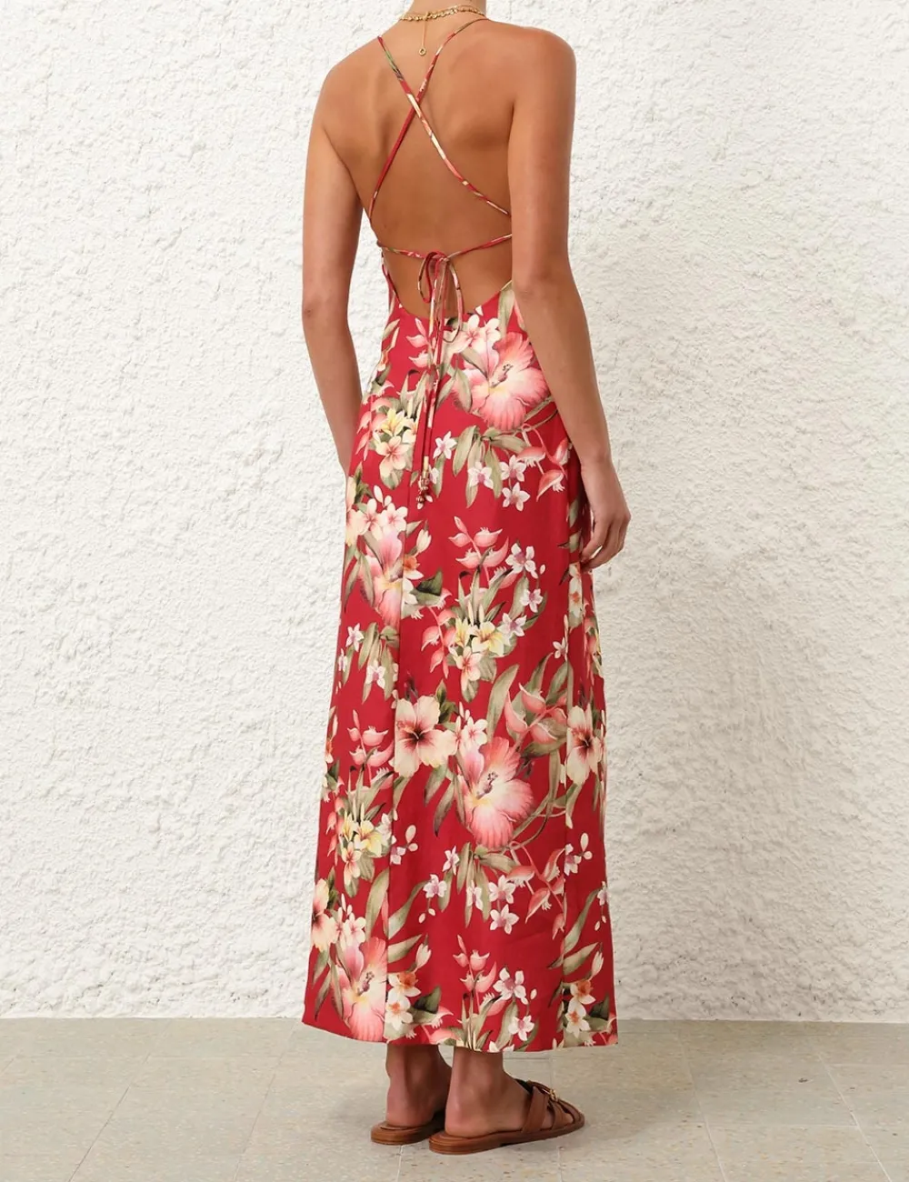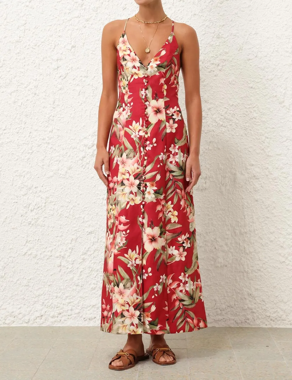 The Lexi Slip Dress In Red Palm From Our Resort Swim 2024 Collection. A Linen Slip Dress Featuring Buttons And Loops Down The Centre Front And Cross Back Tie Detail.