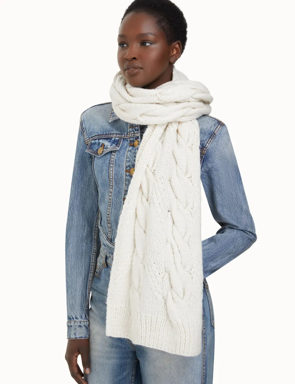 The Luminosity Cable Beanie In Cream From Our Fall 2023 Collection, Luminosity. A Hand Knitted Scarf Featuring A Cable Stitch Throughout.