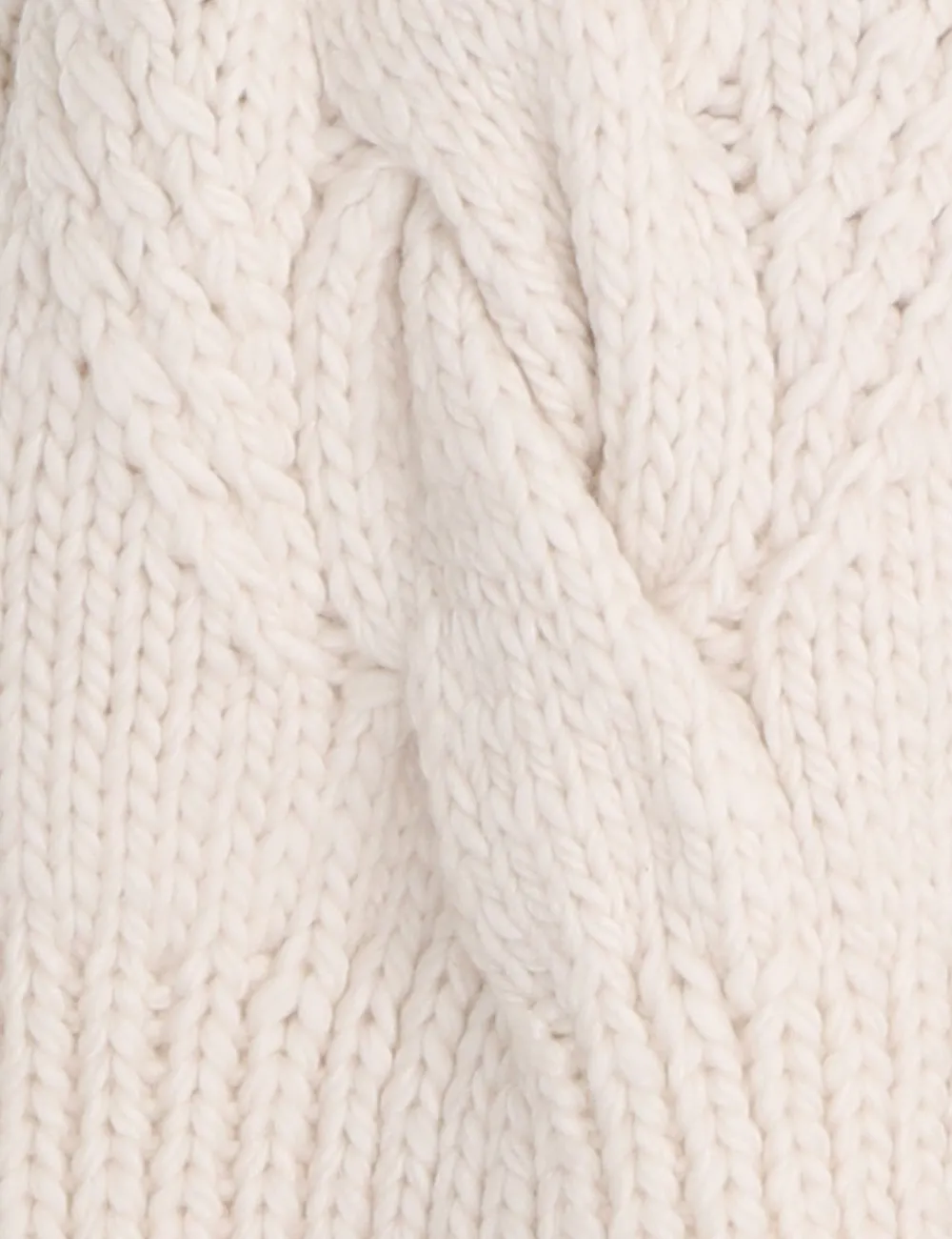 The Luminosity Cable Beanie In Cream From Our Fall 2023 Collection, Luminosity. A Hand Knitted Scarf Featuring A Cable Stitch Throughout.