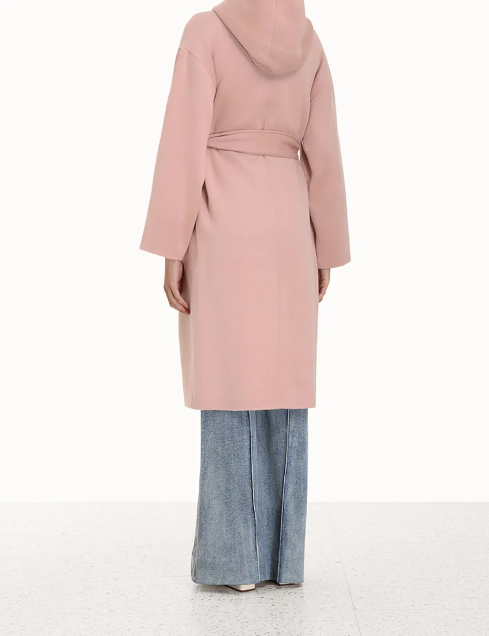The Luminosity Felted Hooded Coat In Dusty Pink From Our Fall 2023 Collection, Luminosity. A Wrap Style Wool Coat Featuring A Hood And In Seam Pockets.