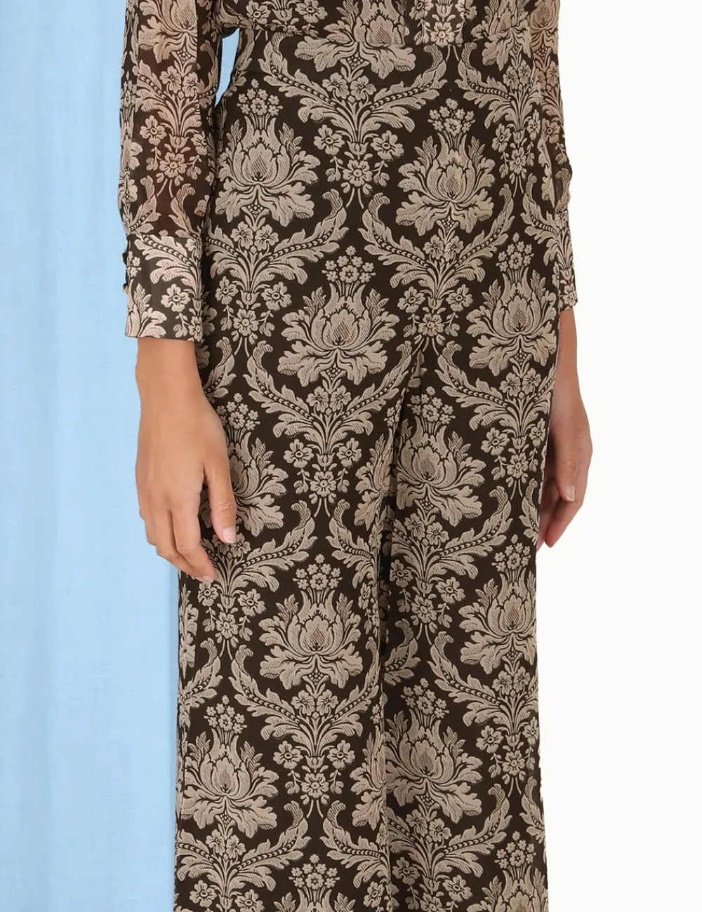 The Luminosity Flare Pant In Black Damask From Our Fall 2023 Collection, Luminosity. A High Waisted, Wide Leg Pant Featuring A Flared Silhouette.