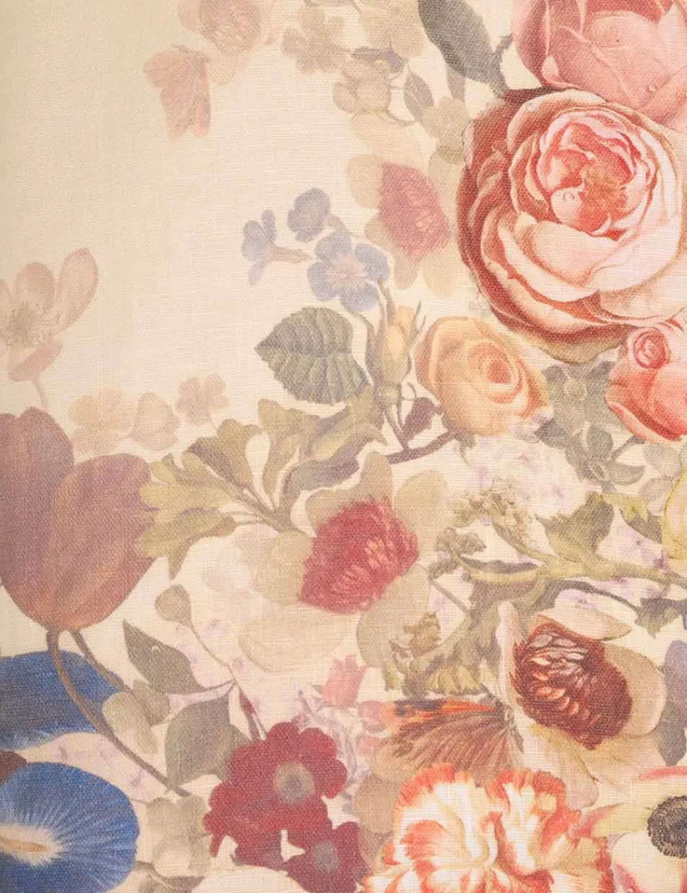 The Luminosity Liftoff Flower Top In Morisot Cream Print From Our Fall 2023 Collection, Luminosity. A Silk Linen Slim Bodice Featuring Short Sleeves And A Funnel Neck, Finished With 3D Moulded Flowers.