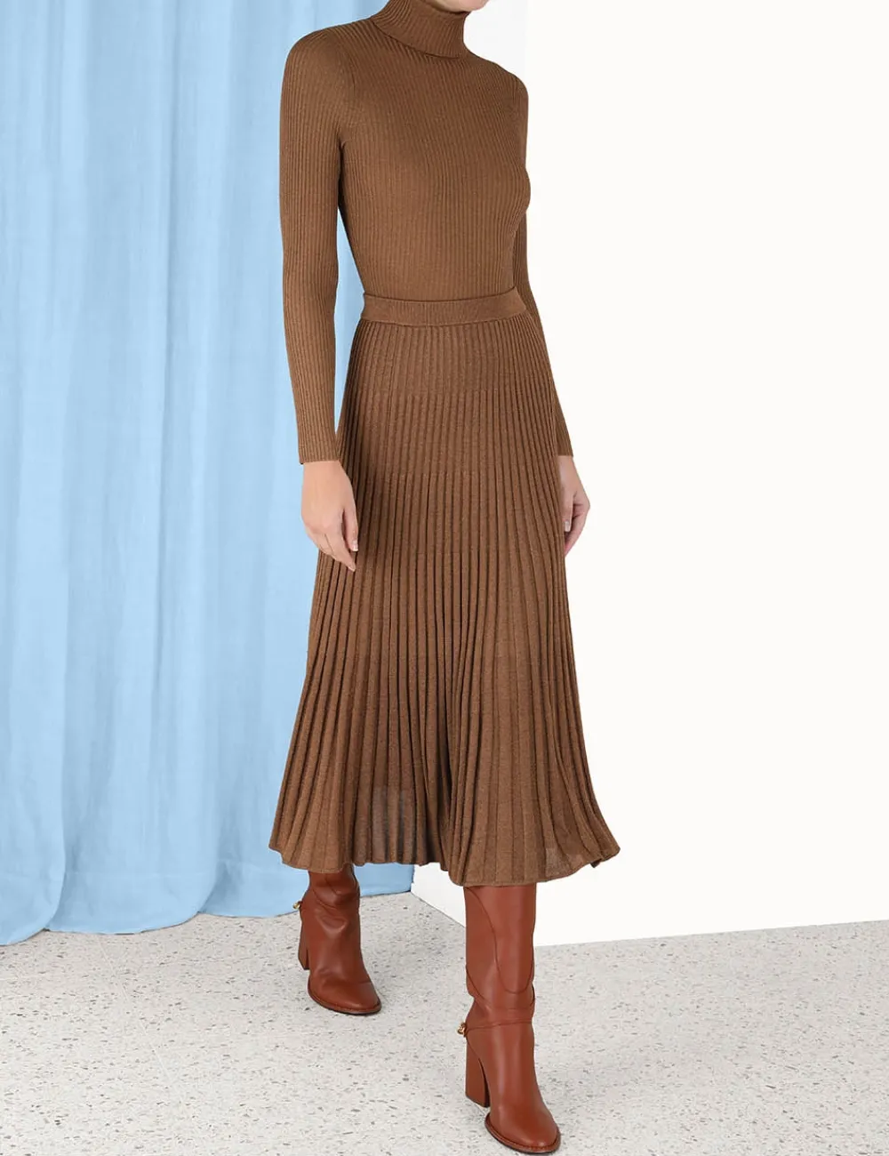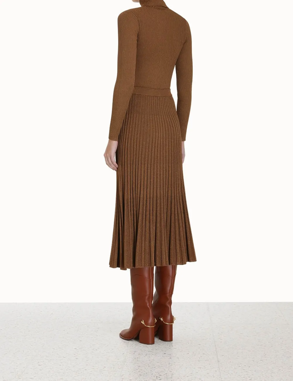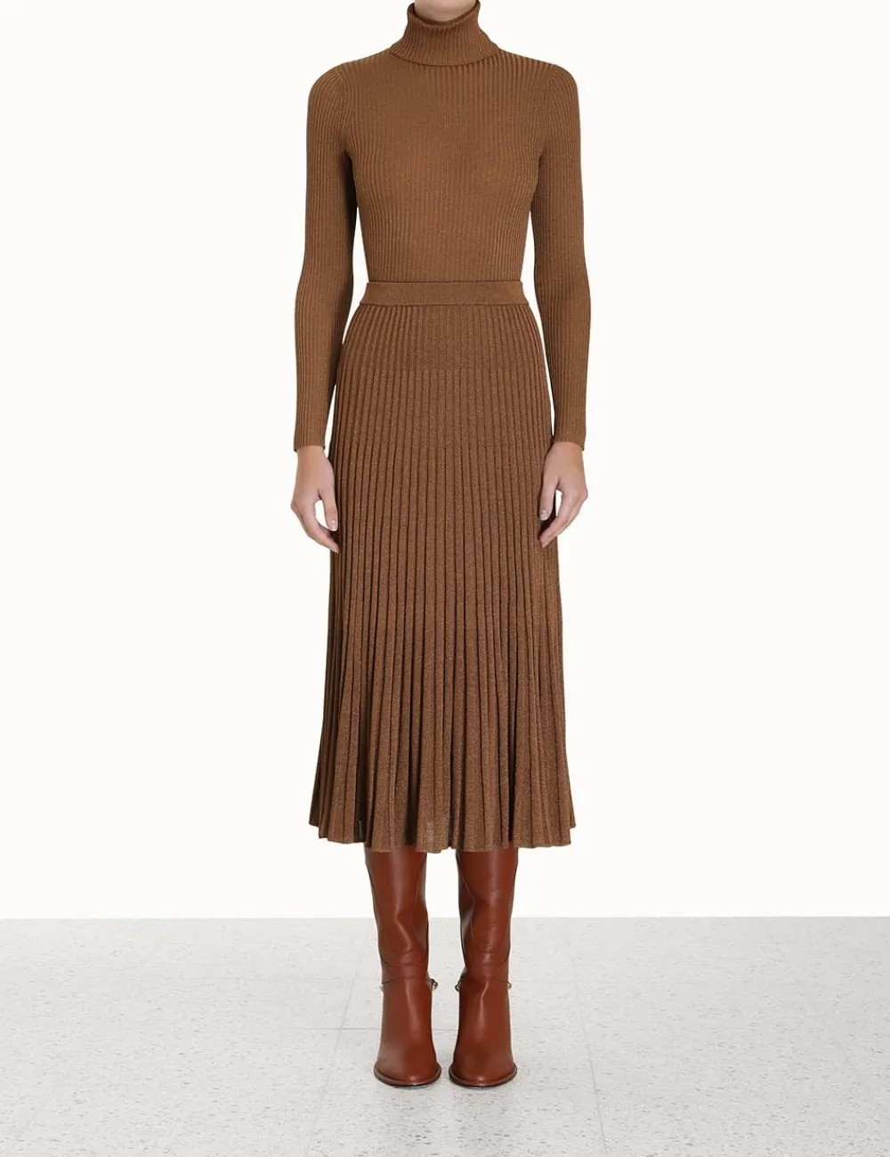 The Luminosity Lurex Midi Skirt In Tan From Our Fall 2023 Collection, Luminosity. A Pleated Knit Skirt Featuring Lurex Thread Throughout.
