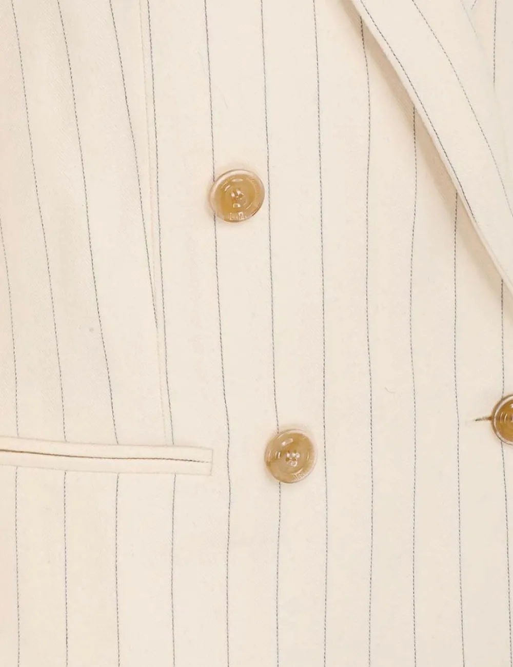 The Luminosity Relaxed Jacket In Cream Stripe From Our Fall 2023 Collection, Luminosity. A Wool Blend, Longline Jacket Featuring Shoulder Pads And A Double Breasted Closure.