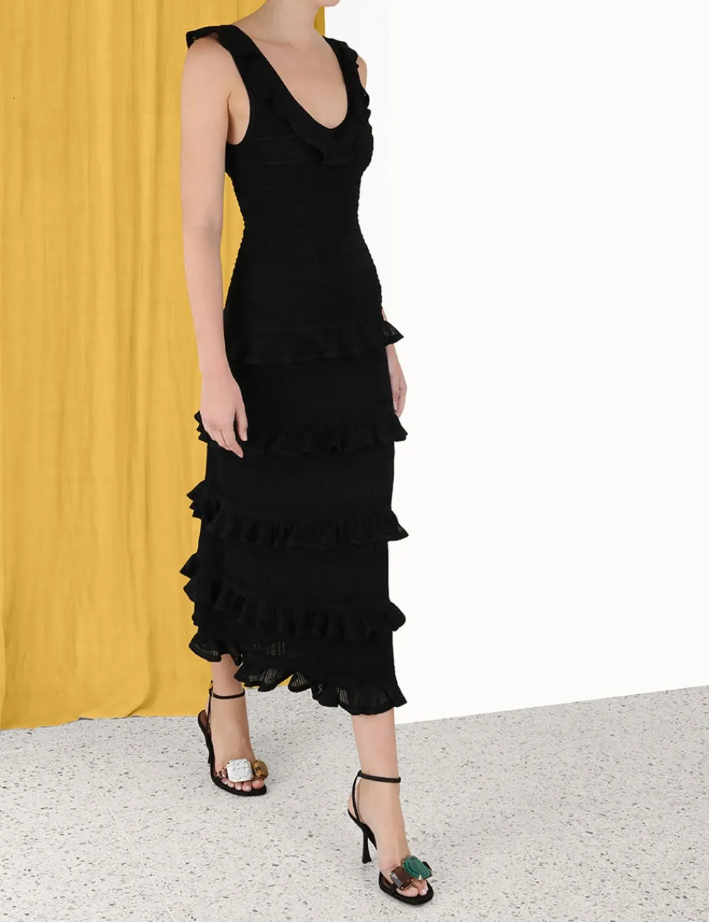 The Luminosity Ruffle Tank Dress In Black From Our Fall 2023 Collection, Luminosity. A Knitted Midi Dress Featuring Ruffled Details Throughout.