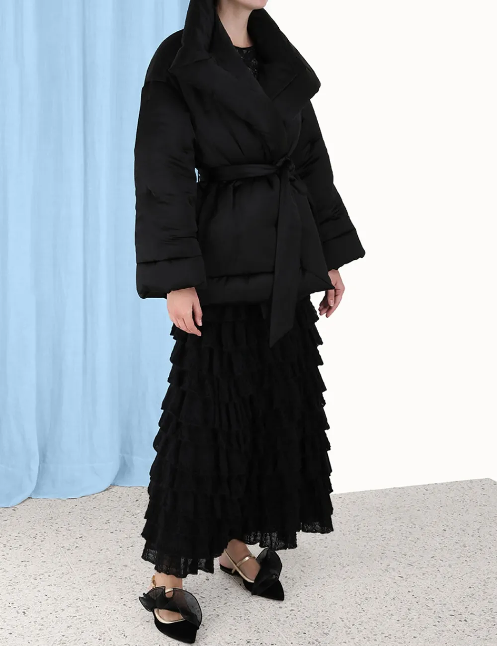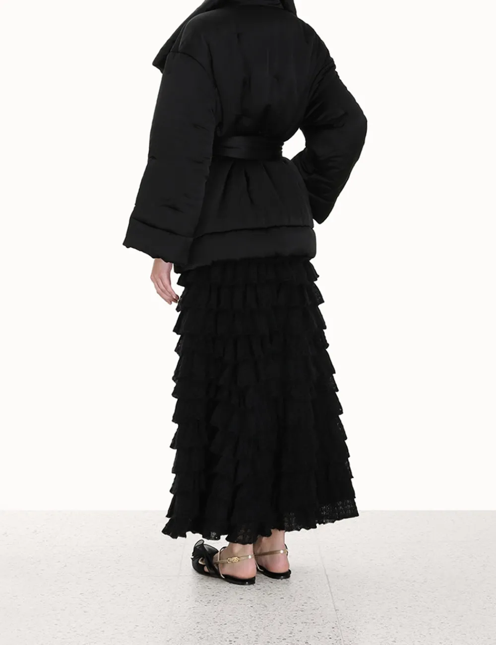 The Luminosity Satin Wadded Jacket In Black From Our Fall 2023 Collection, Luminosity. A Satin Jacket Featuring An Oversized Lapel And Self Tie Waist.