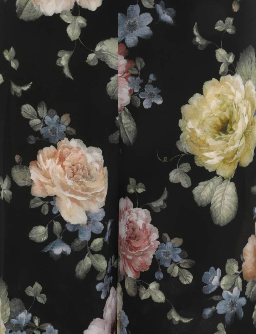 The Luminosity Trouser In Multi Floral Black From Our Fall 2023 Collection, Luminosity. A Silk Twill High Waisted Trouser Featuring Contrast Panels And A Removable Belt.