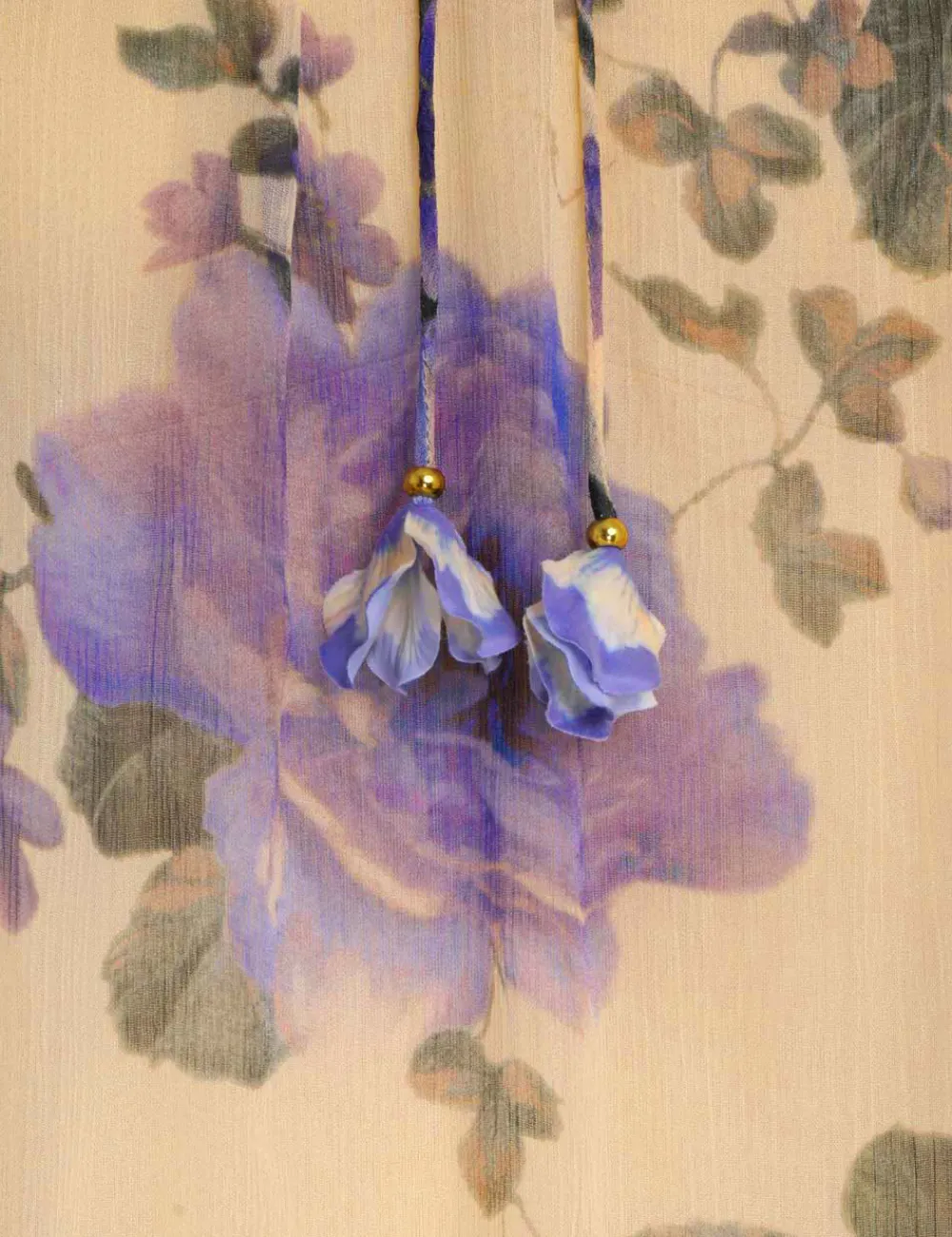 The Lyrical Billow Blouse In Blue Floral Print From Our Fall 2023 Collection, Luminosity. A Crinkle Georgette Blouse Featuring 3D Flower Appliques At The Collar And Neck Ties.